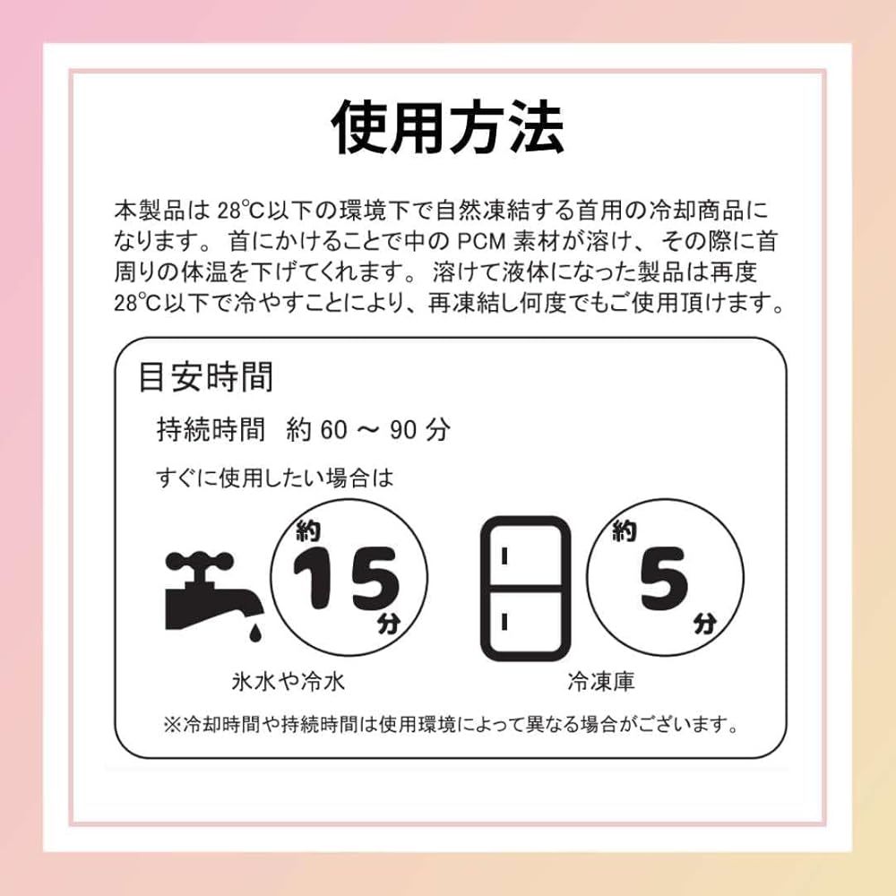 ・溶けて液体になった製品は再度28℃以下で冷やすことにより、再度凍結し何度でもご使用頂けます。 「主な仕様」・本製品は28℃以下の環境下で自然凍結する首用の冷却商品になります。 ・首にかけることで中のPCM素材が溶け、その際に首周りの体温を下げてくれます。 ・溶けて液体になった製品は再度28℃以下で冷やすことにより、再度凍結し何度でもご使用頂けます。
