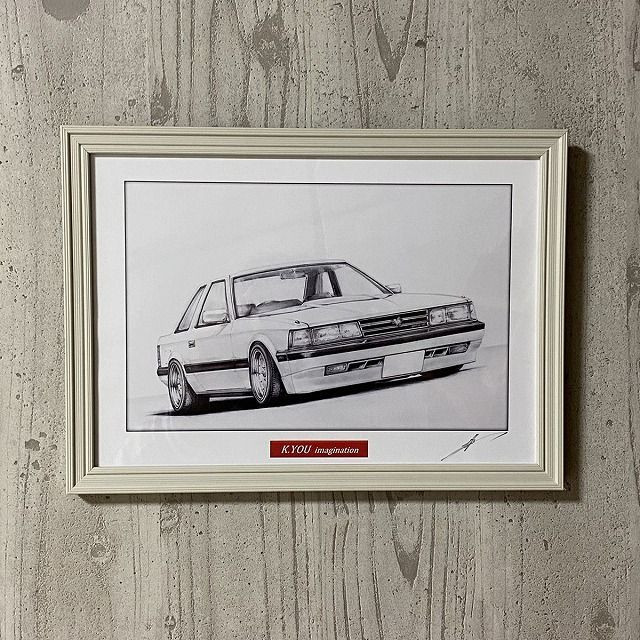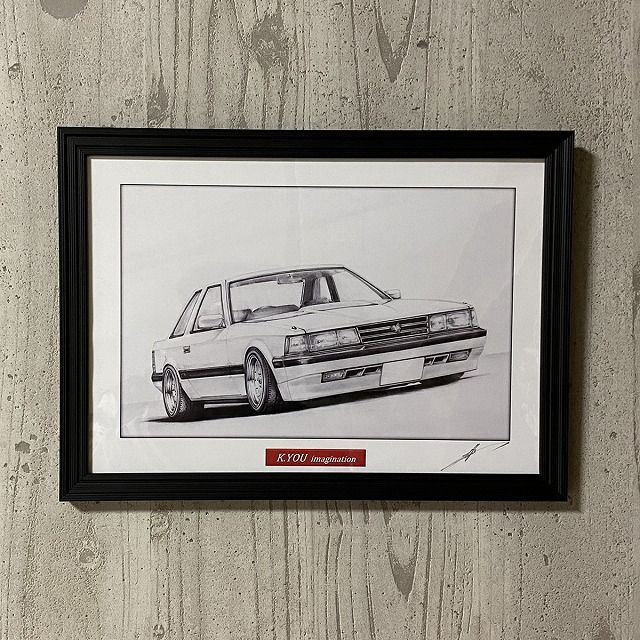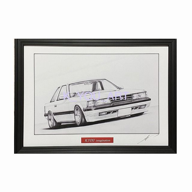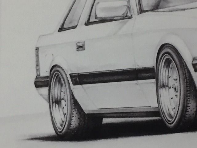 昔懐かしい日本の名車を鉛筆のみで描いています。地面ギリギリの車体にワイドタイヤでツライチにすることでパワーを感じる作品にしています。