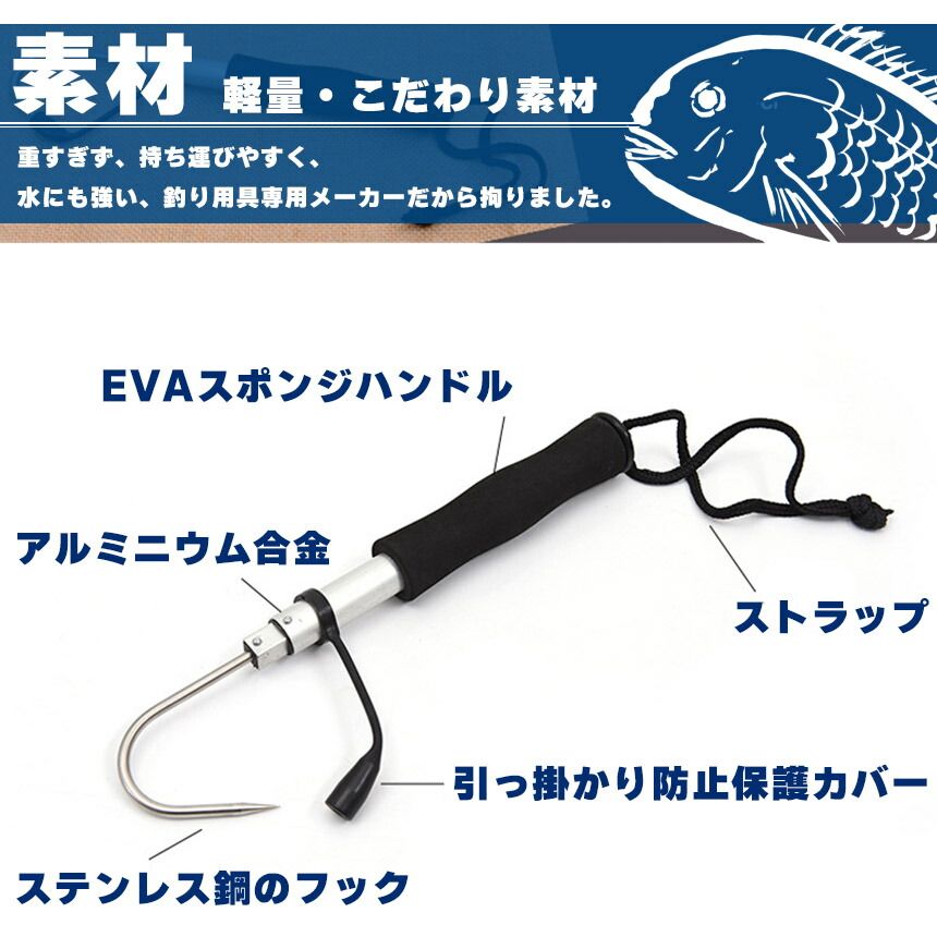 ハンドルはEVAで水にも強く握りやすく滑りにくい!ボディーはアルミニウム合金で軽量、フックはステンレスでしっかりひっかける!