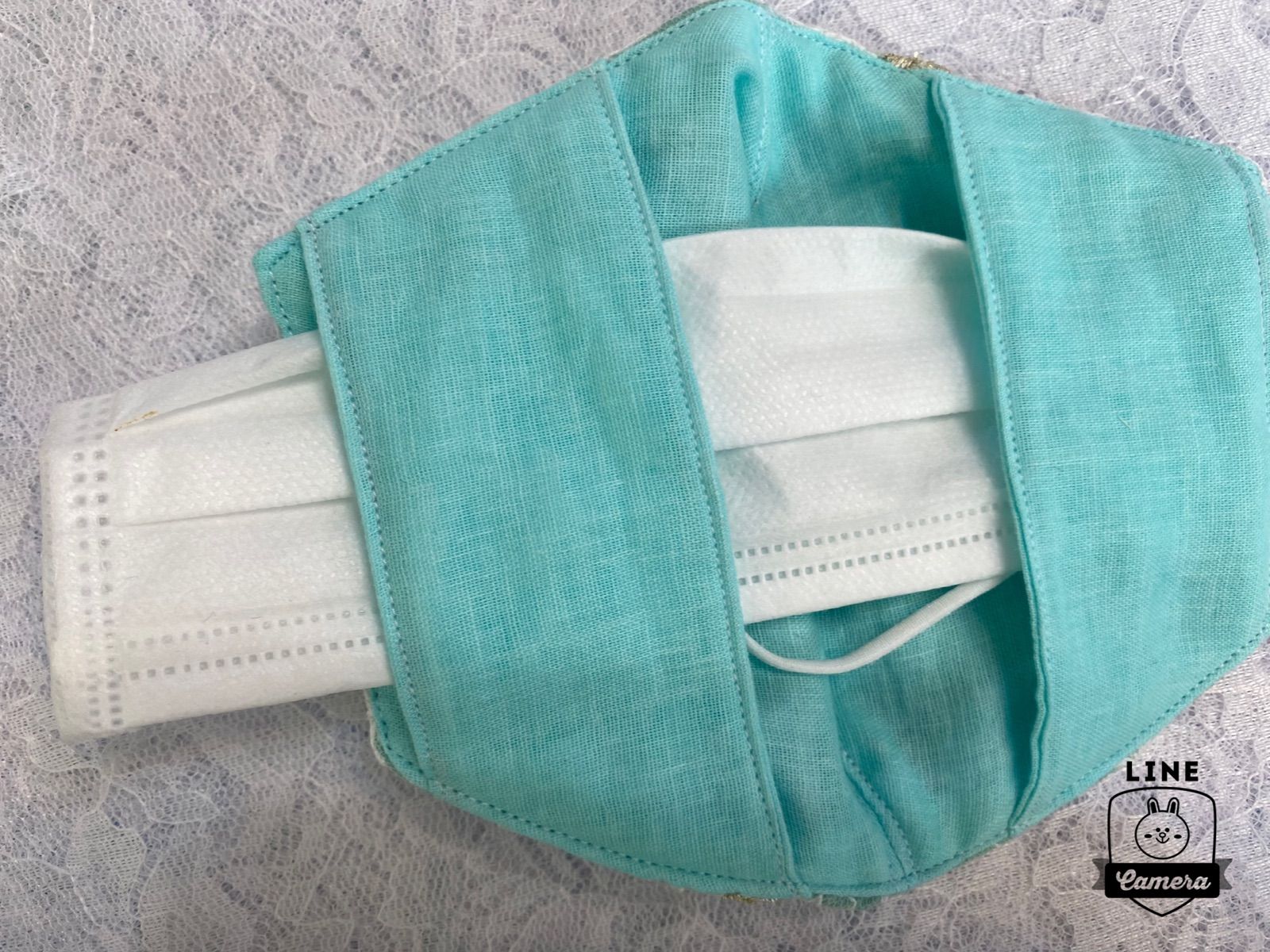 不織布マスクをガーゼの帯に通してお使いください♡中に挟むのより、こちらの方が簡単と好評です。レースより押さえる力も強く今このパターンに替えています。