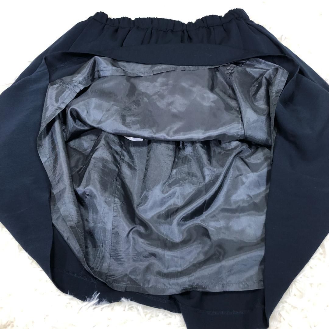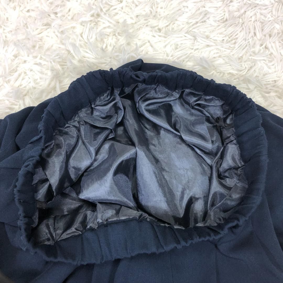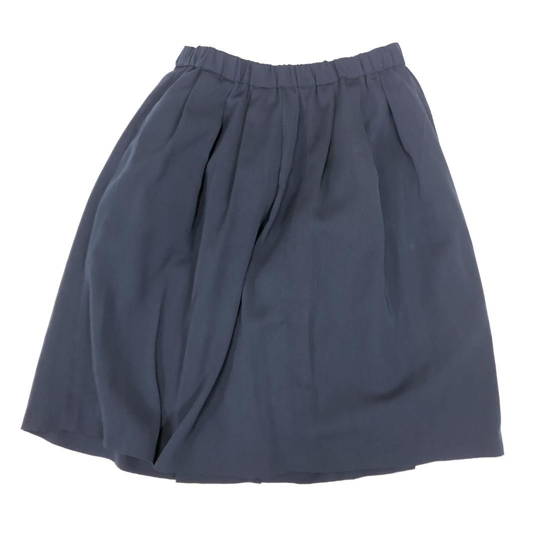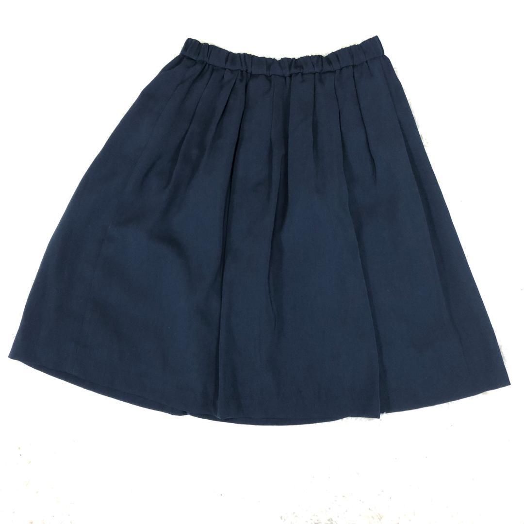 落ち着いたネイビーカラーのフレアスカートです。ウエストは総ゴムで履き心地が良く、Aラインのシルエットが女性らしい印象を与えます。オールシーズンお使いいただけます。裏地付き。身長160cm着用で膝が隠れる丈です。