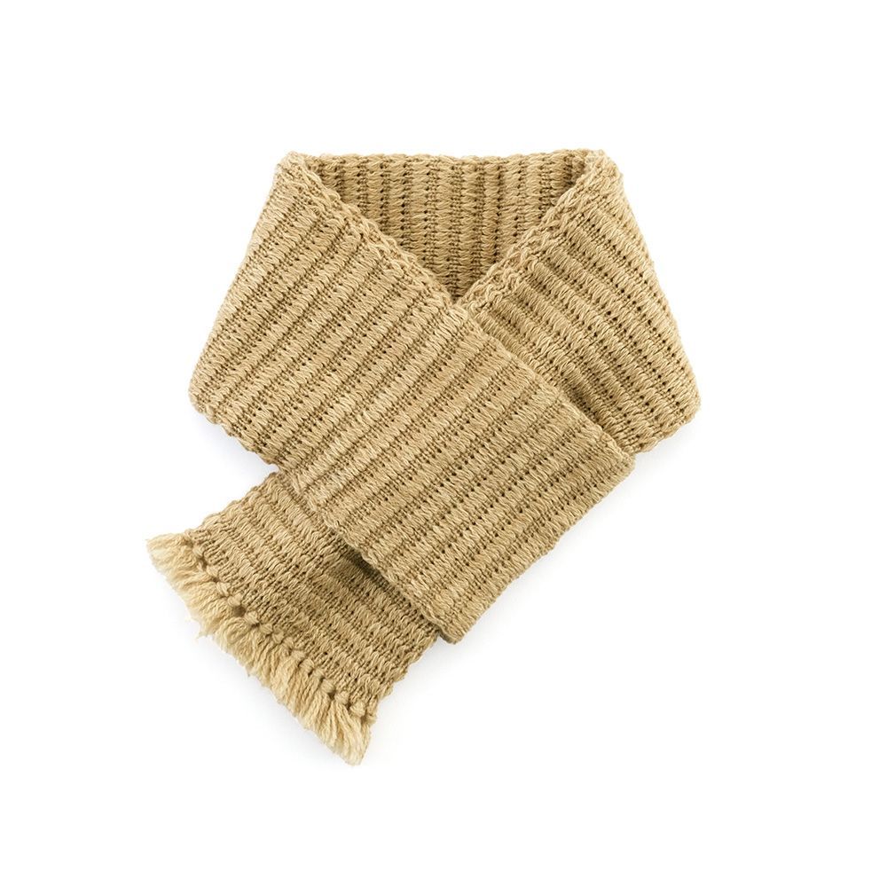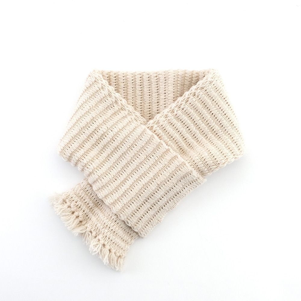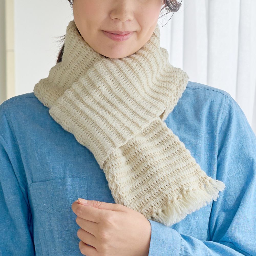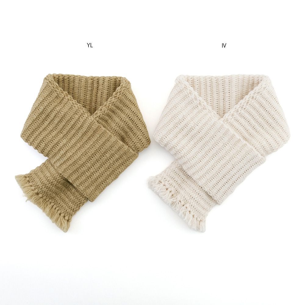 羊をイメージしたトンネル編みの地模様が特徴の、フリンジ付きミニマフラー。立体感のある編地が、ほっこりとした温もりを演出します。コンパクトながら存在感のあるデザインで、コーディネートのアクセントにもぴったり。寒い季節に優しく寄り添う、癒しのマフラーです。