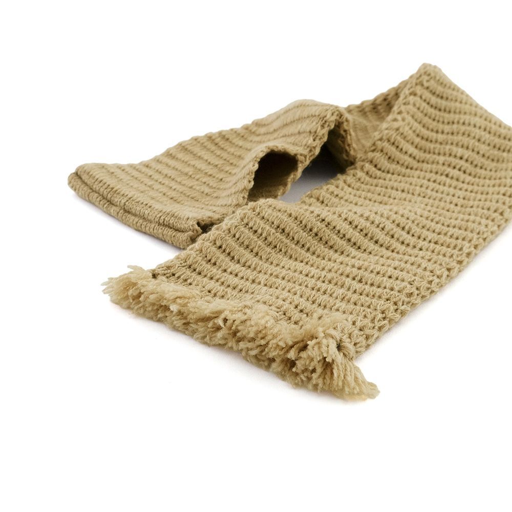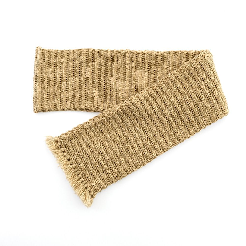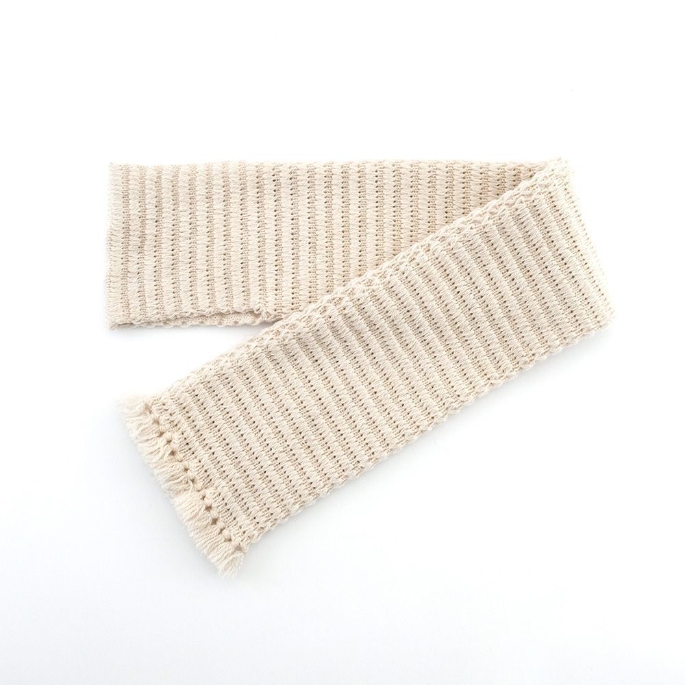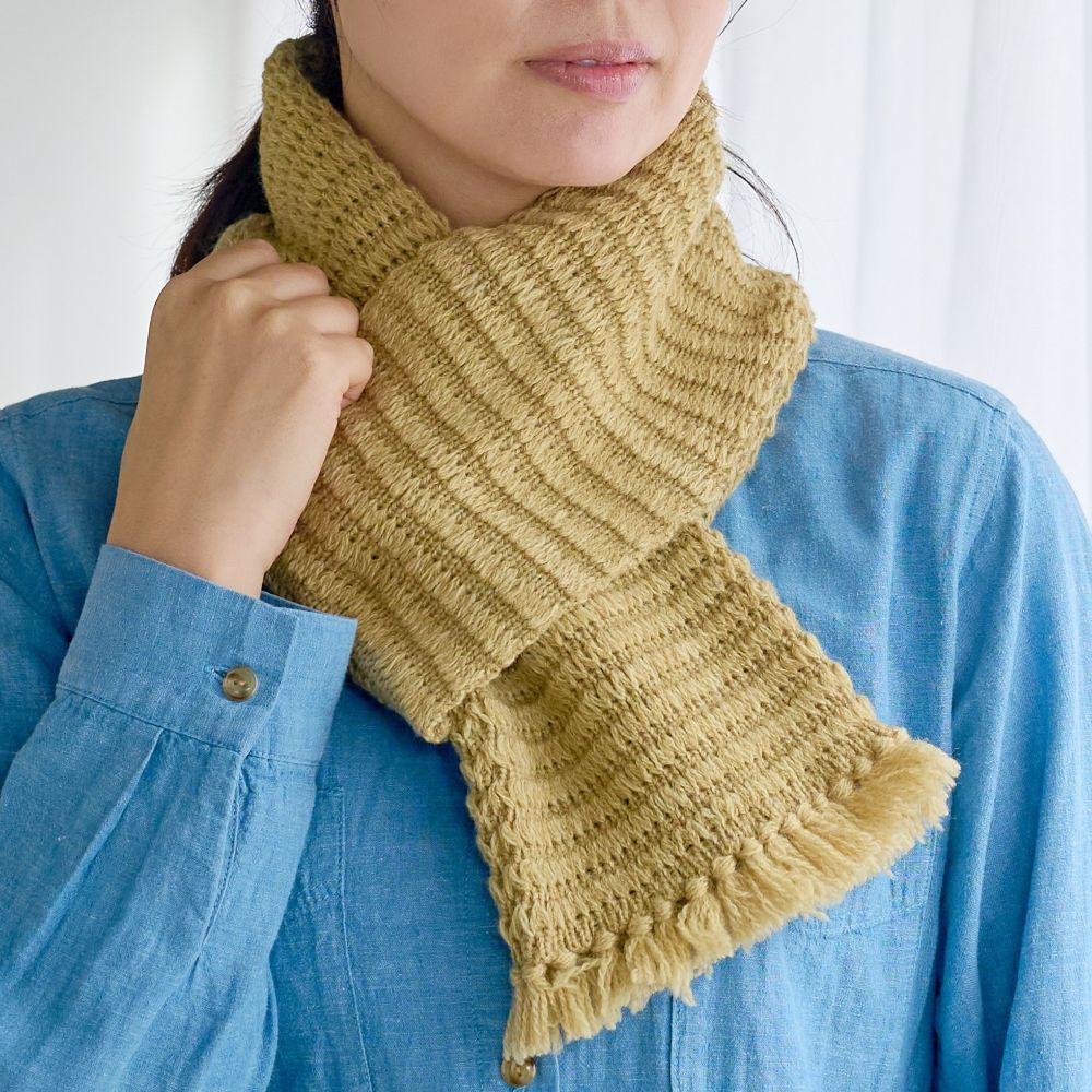 羊をイメージしたトンネル編みの地模様が特徴の、フリンジ付きミニマフラー。立体感のある編地が、ほっこりとした温もりを演出します。コンパクトながら存在感のあるデザインで、コーディネートのアクセントにもぴったり。寒い季節に優しく寄り添う、癒しのマフラーです。