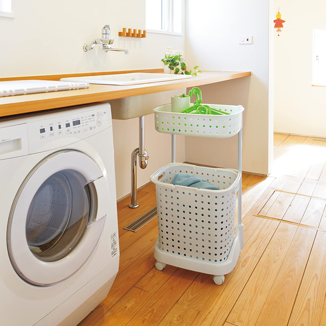 上段にはタオルや着替え、下段は脱衣カゴとして使用するなど、上下で使い分けできます。洗濯物の分別に使えば仕分けの手間が省けて時短に。下段のバスケットは大容量の深型タイプ。洗濯物干し場までの移動に便利なハンドル付き。安心の日本製。