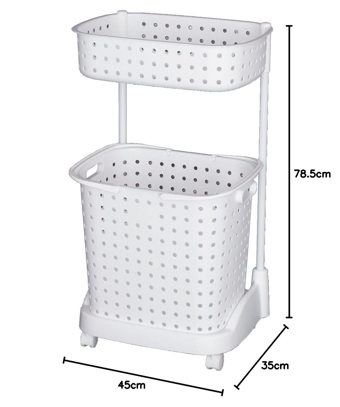 サイズ(重量)(約):製品/45×35×78.5cm (2000g)、上カゴ/41.6×28.4×10.8cm、下カゴ/34.8×24.8×36.5cm