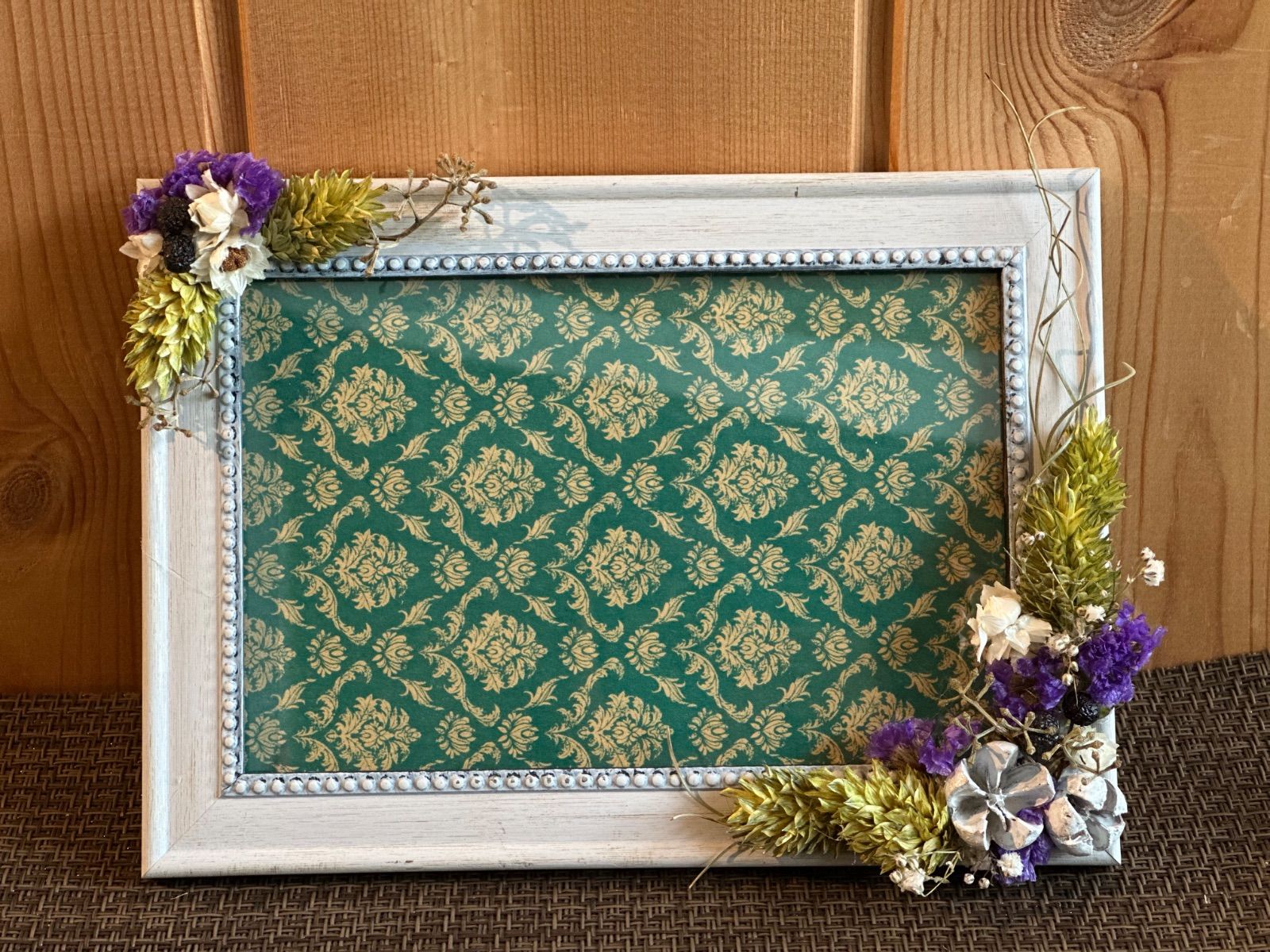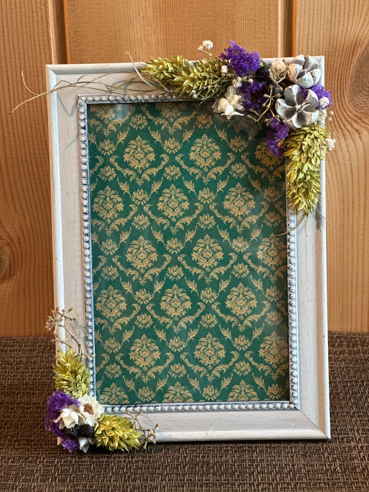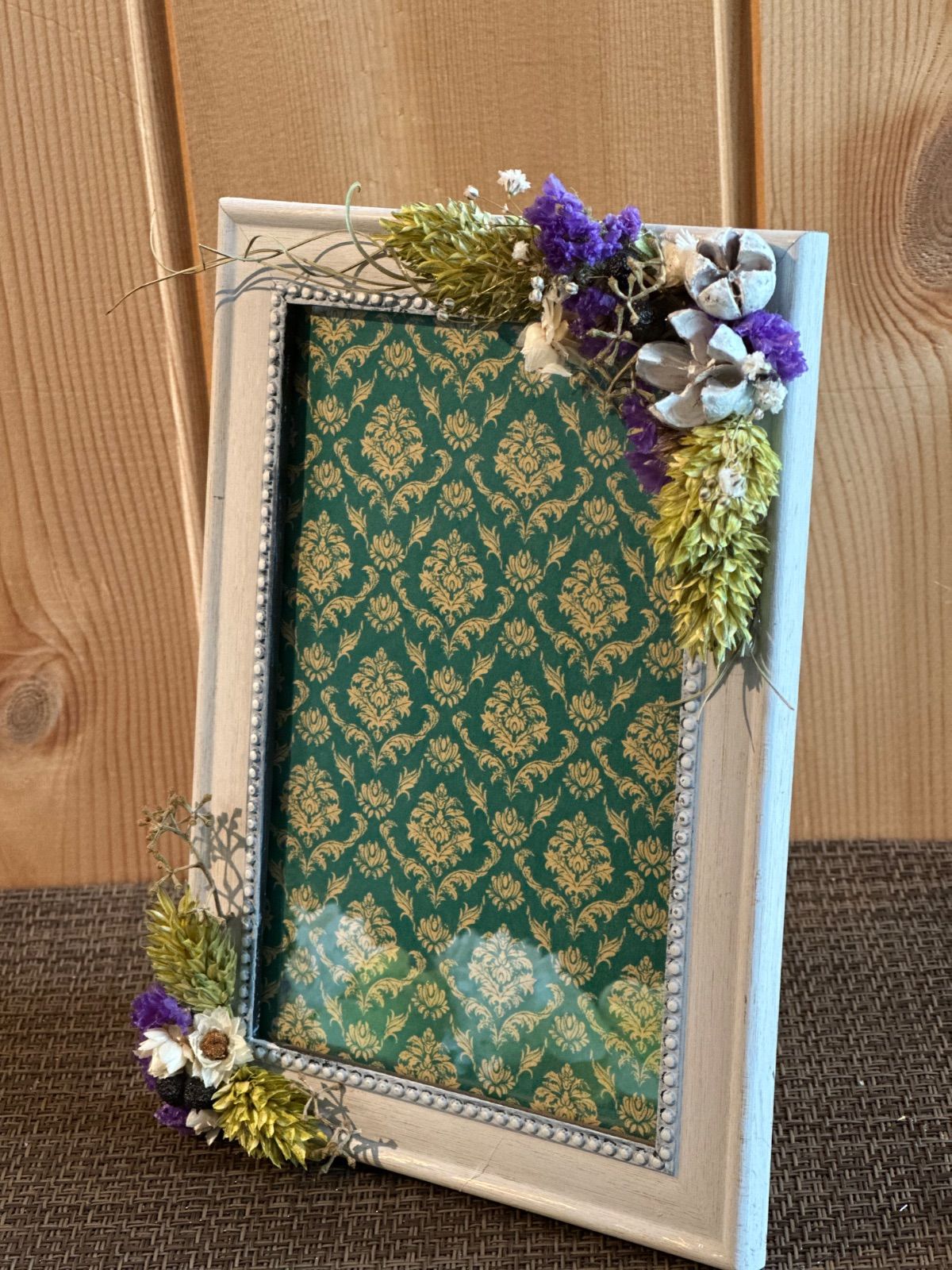 アーティシャルフラワーとドライフラワーでデコレーションしたフォトフレームになります。