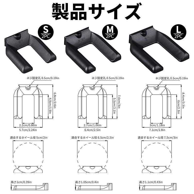 【多サイズ対応】キャスター固定具はS/M/Lの3サイズ展開で、6個セットで多様なニーズに対応します。Sサイズは直径50mm(2インチ)のキャスター、Mサイズは直径65mm(2.5インチ)のキャスター、Lサイズは直径75mm(3インチ)のキャスターに対応し、多様なキャスター規格に対応可能です。