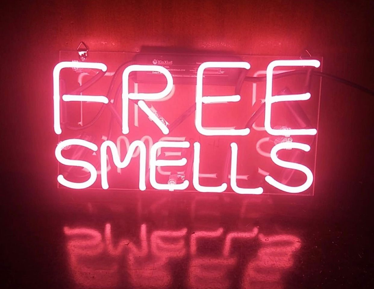 ・デザイン:「FREE SMELLS(香り無料)」のユニークなメッセージをピンクネオンで表現したアート看板。おしゃれで遊び心のある空間演出にぴったりです。