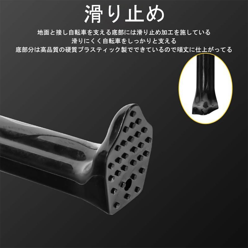 【高品質素材】ボディは高品質のアルミニウム合金製で、頑丈で耐久性に優れています。またネジ部分はステンレス製で防錆性能に優れています。地面と接し自転車を支える底部には滑り止め加工を施しています。滑りにくく自転車をしっかりと支えます。底部分は高品質の硬質プラスティック製でできているので頑丈に仕上がってます。