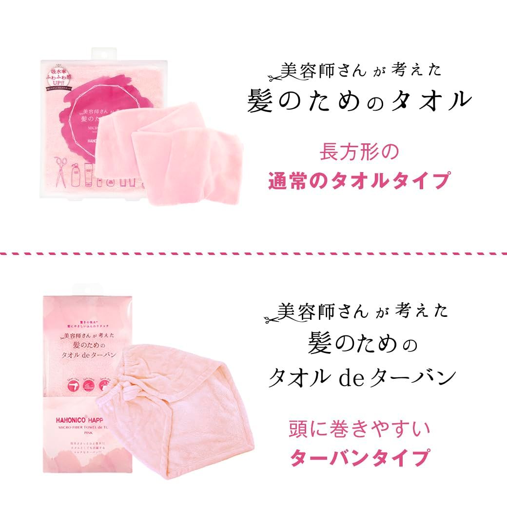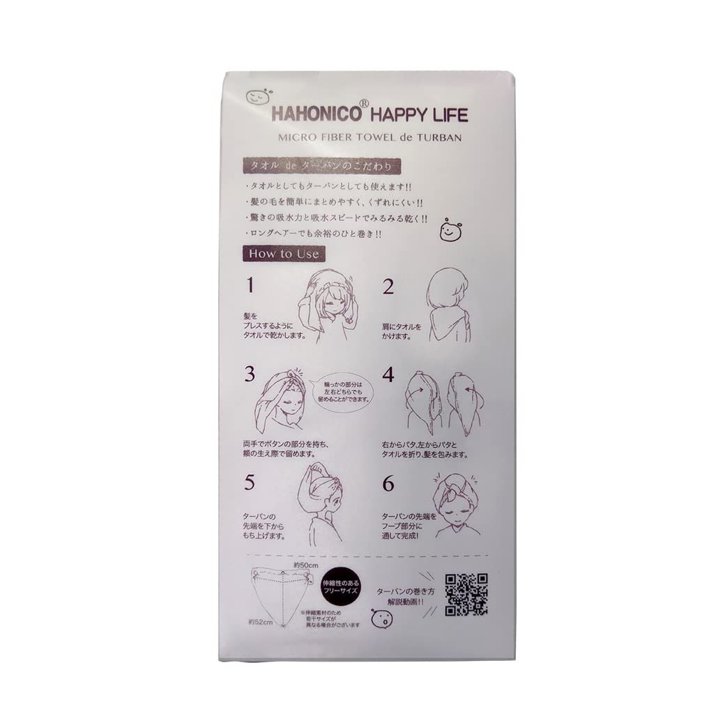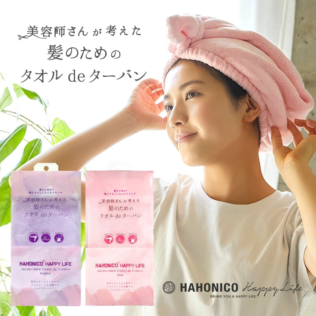 ハホニコ ヘアドライマイクロファイバータオル「美容師さんが考えた髪のためのタオル」のスナップボタンのついたターバンタイプです。生地は美容師さんが考えた髪のためのタオルと同じものを使用しているので、吸水性に優れ、水分を瞬時に拭き取りドライヤーをかける時間を大幅に短縮します。ヘアドライタオルにスナップボタンが付いたような形状で簡単に頭に巻くことができるので、お風呂上りにサッと巻くだけで髪の水分を吸収してくれます。お風呂上りには、サッと頭に巻いて、フェイスケアやお化粧を行い、その後、髪をおさえ拭きすることで髪に残った水分をしっかり吸収し、ドライヤー時間を短縮することができます。ドライヤー時間が短縮=ドライヤーの熱によるヘアダメージを抑えることができます。