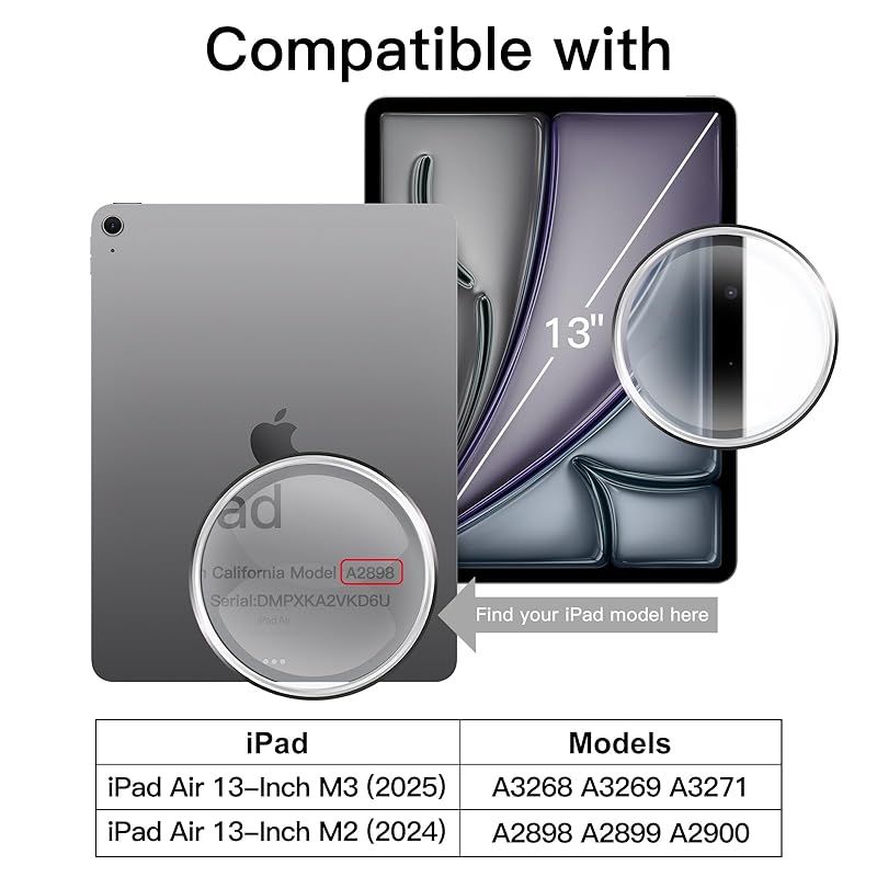 [互換性] iPad Air 13インチM3/M2 (2025/2024)専用です。対応iPadモデル番号:A3268 / A3269 / A3271 / A2898 / A2899 / A2900。「設定」>「一般」>「情報」の順に選択します、「モデル番号」フィールドをタップしてAモデル番号を表示します
