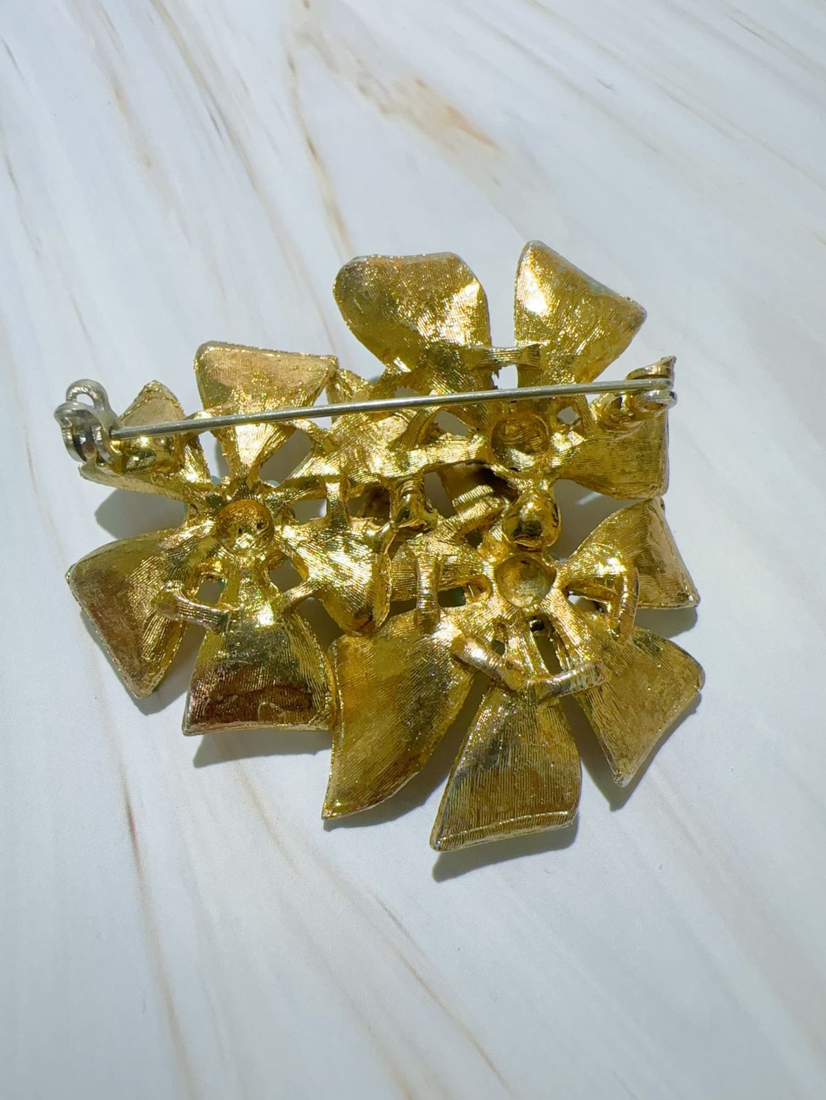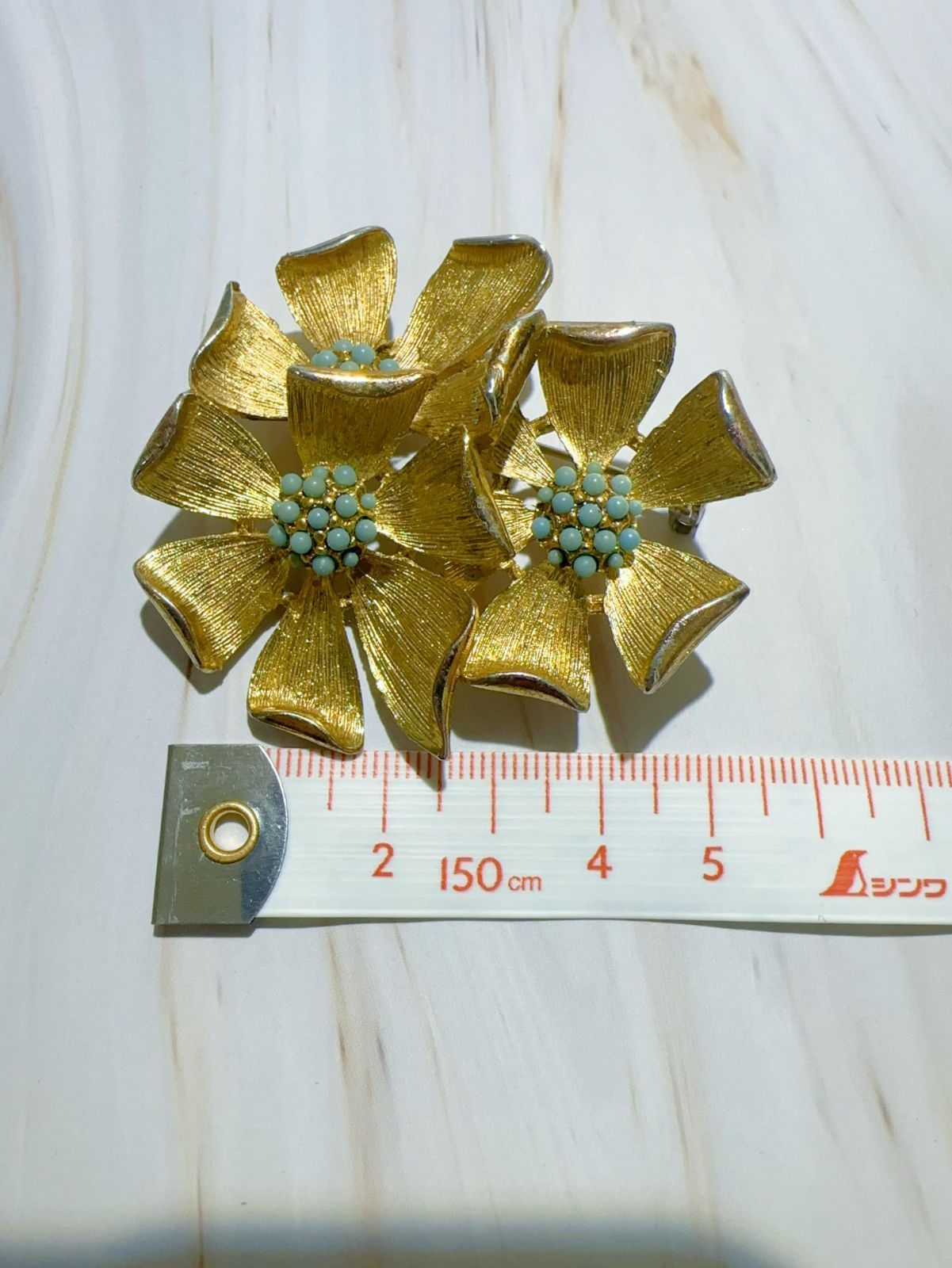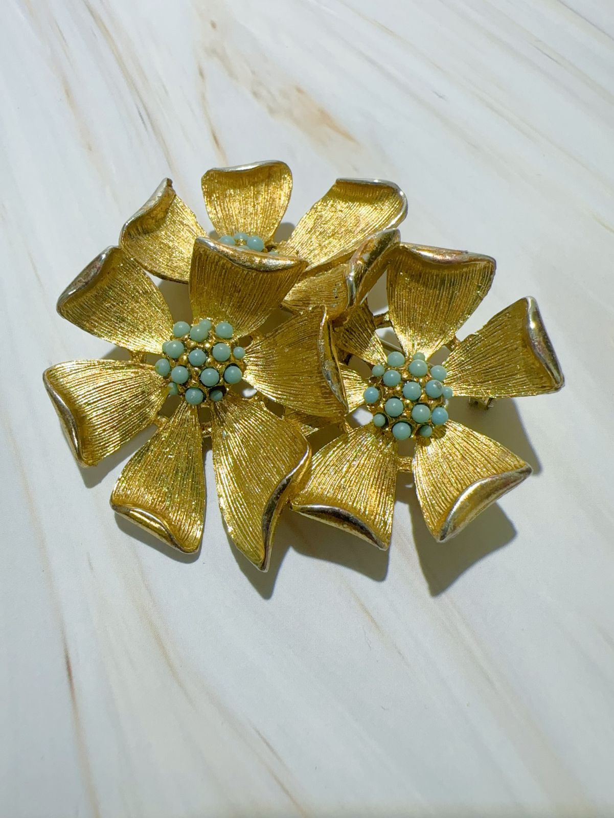 #ヴィンテージブローチ #花モチーフ #フラワーブローチ #レトロアクセサリー #ターコイズビーズ #ゴールドアクセ #中古アクセサリー