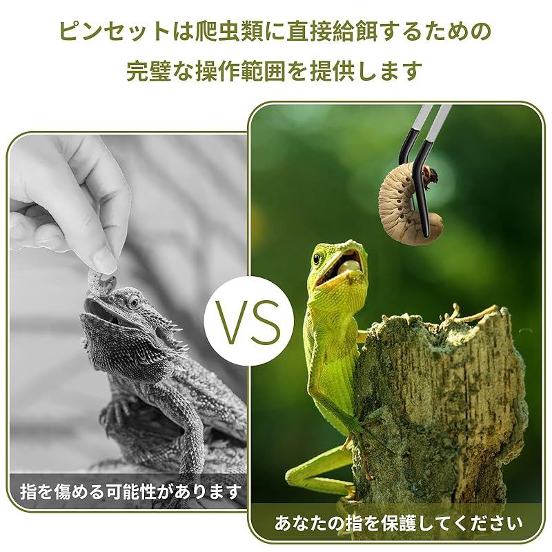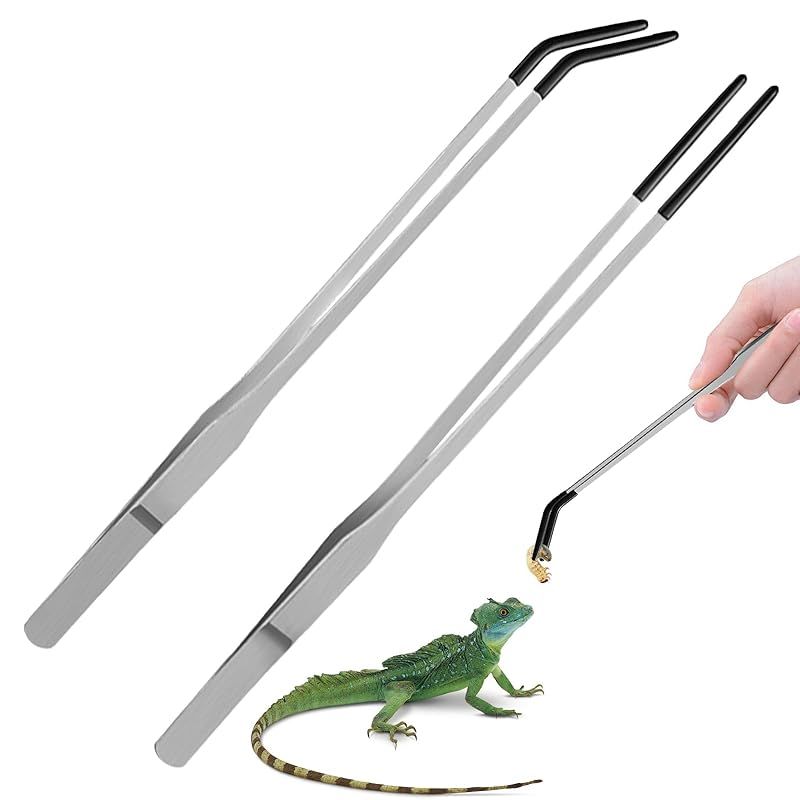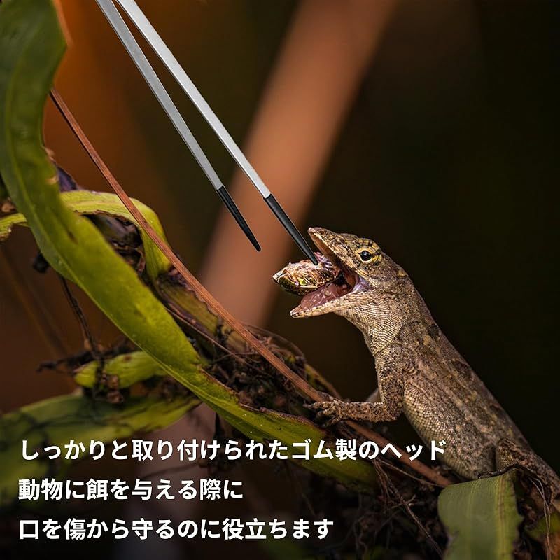 【セット内容】セットに含まれる爬虫類用ピンセットは、直線型1本と曲線型1本の計2本で、全長10.6インチ(約27cm)です。ゴム製の柔らかい先端が動物を保護し、直線的な空間と曲線的な空間の両方の給餌ニーズに対応します。