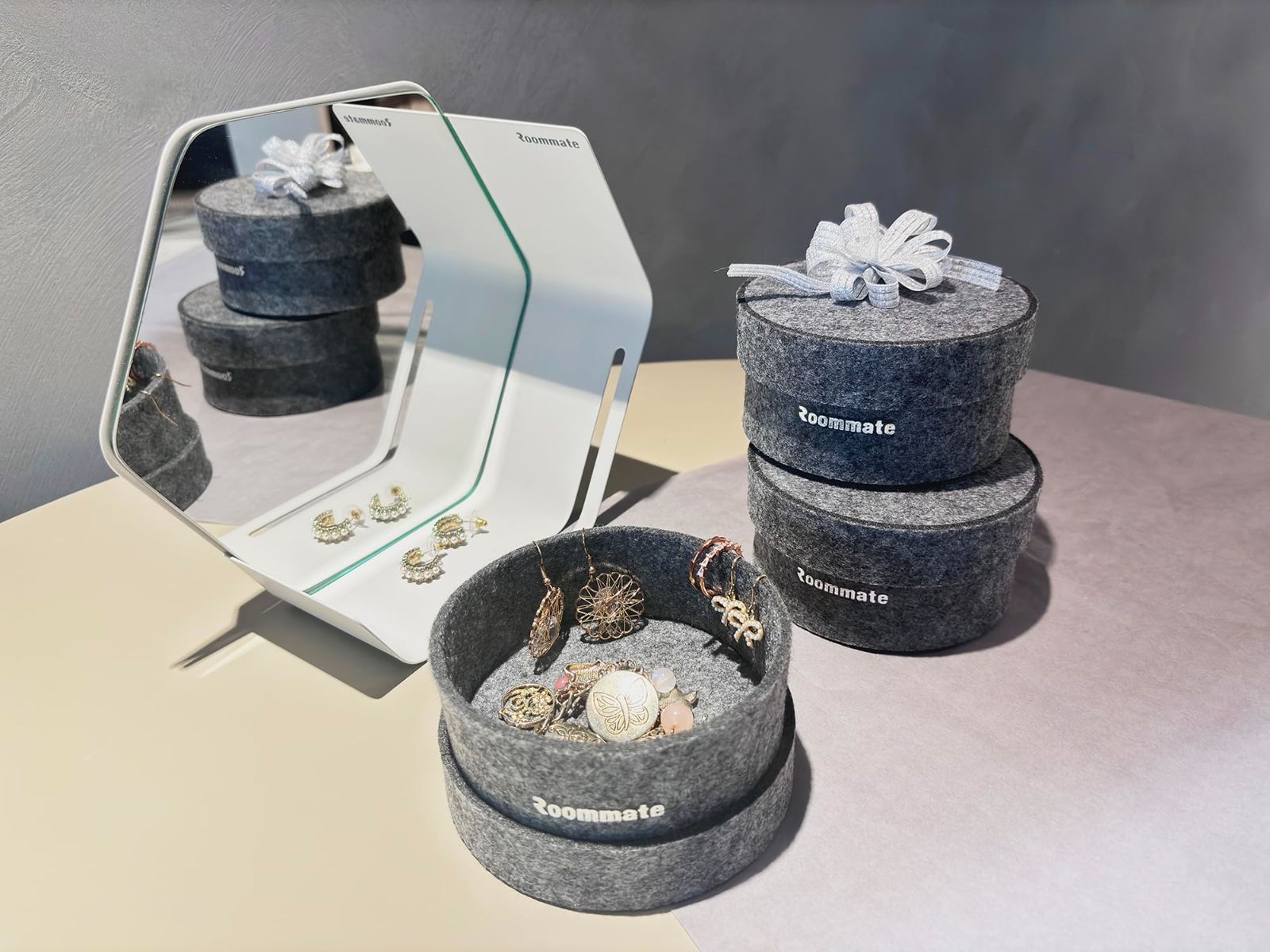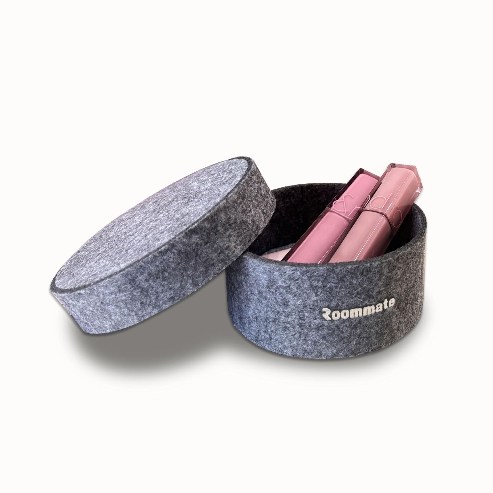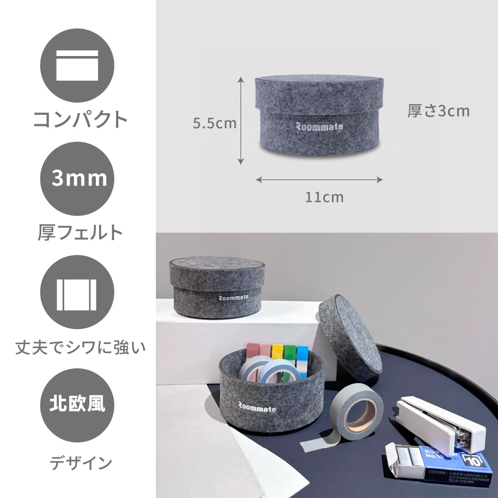 Roommate 収納ボックス 丸型 (11x11x5.5cm) | 北欧スタイル 小物収納ケース かご 取っ手付き 卓上 収納 リモコン ケース 文房具 オフィス 玄関 キー バスケット トレー 化粧品 ペン立て 灰色