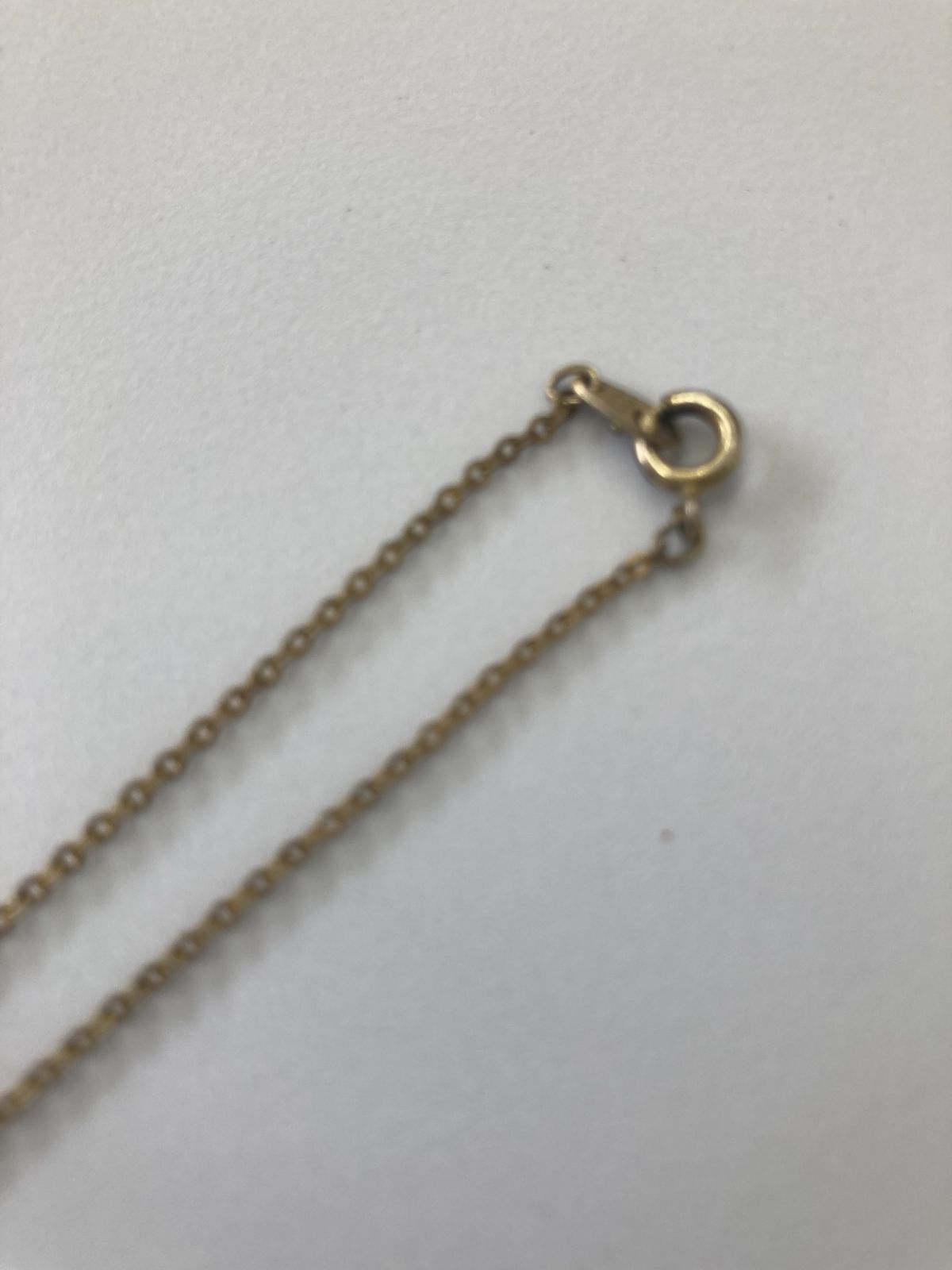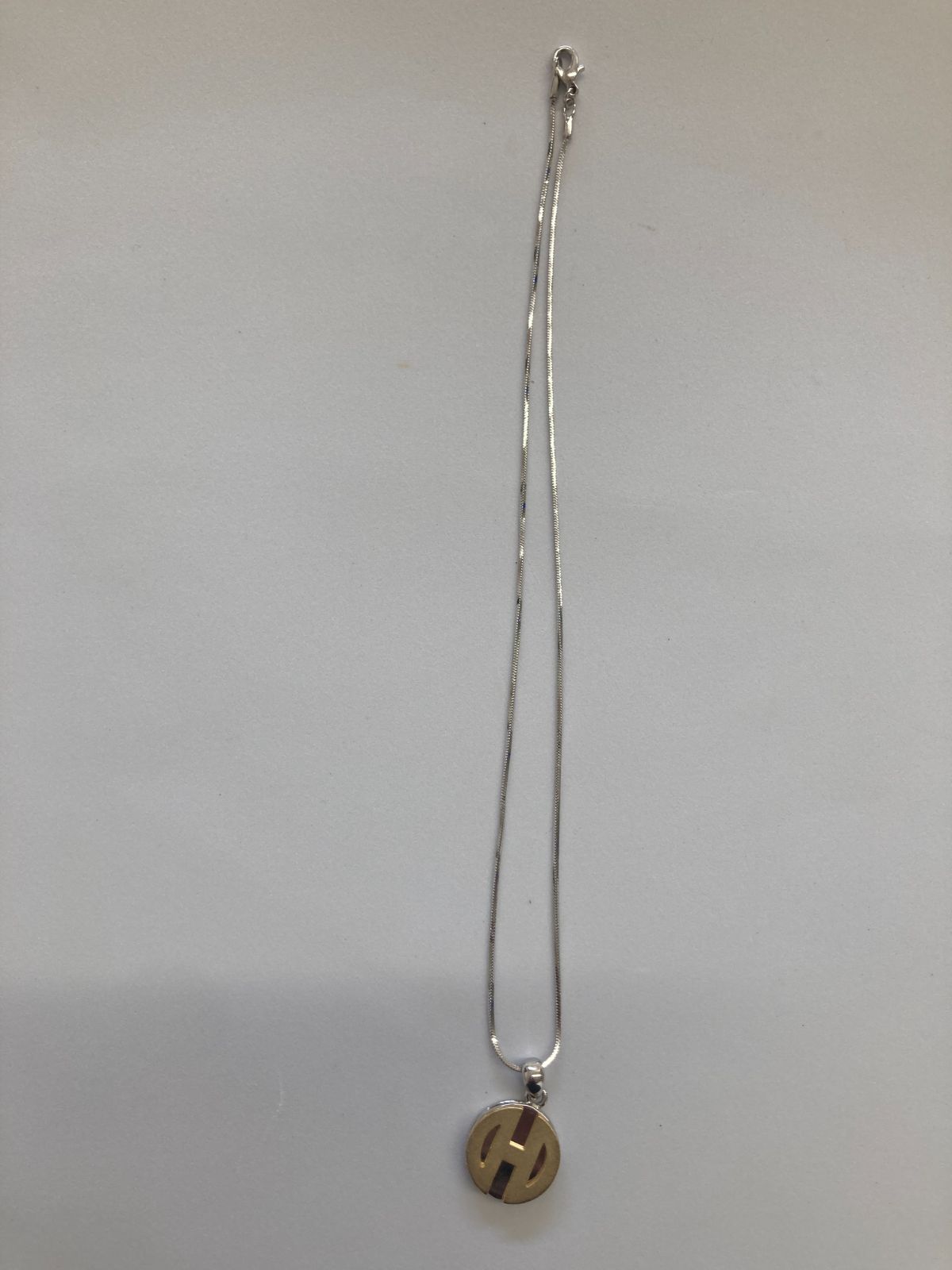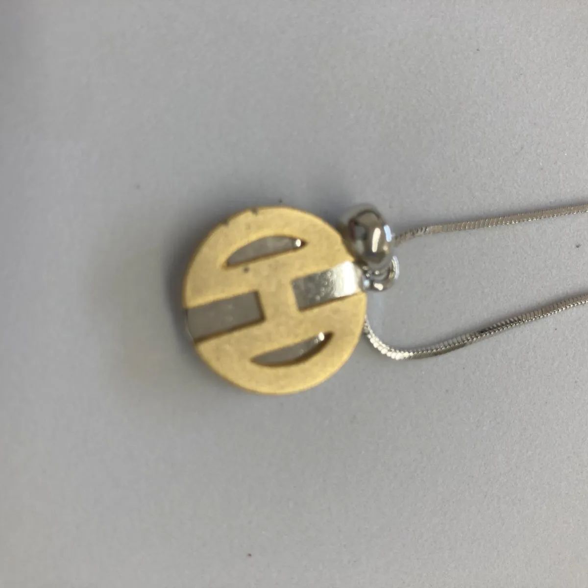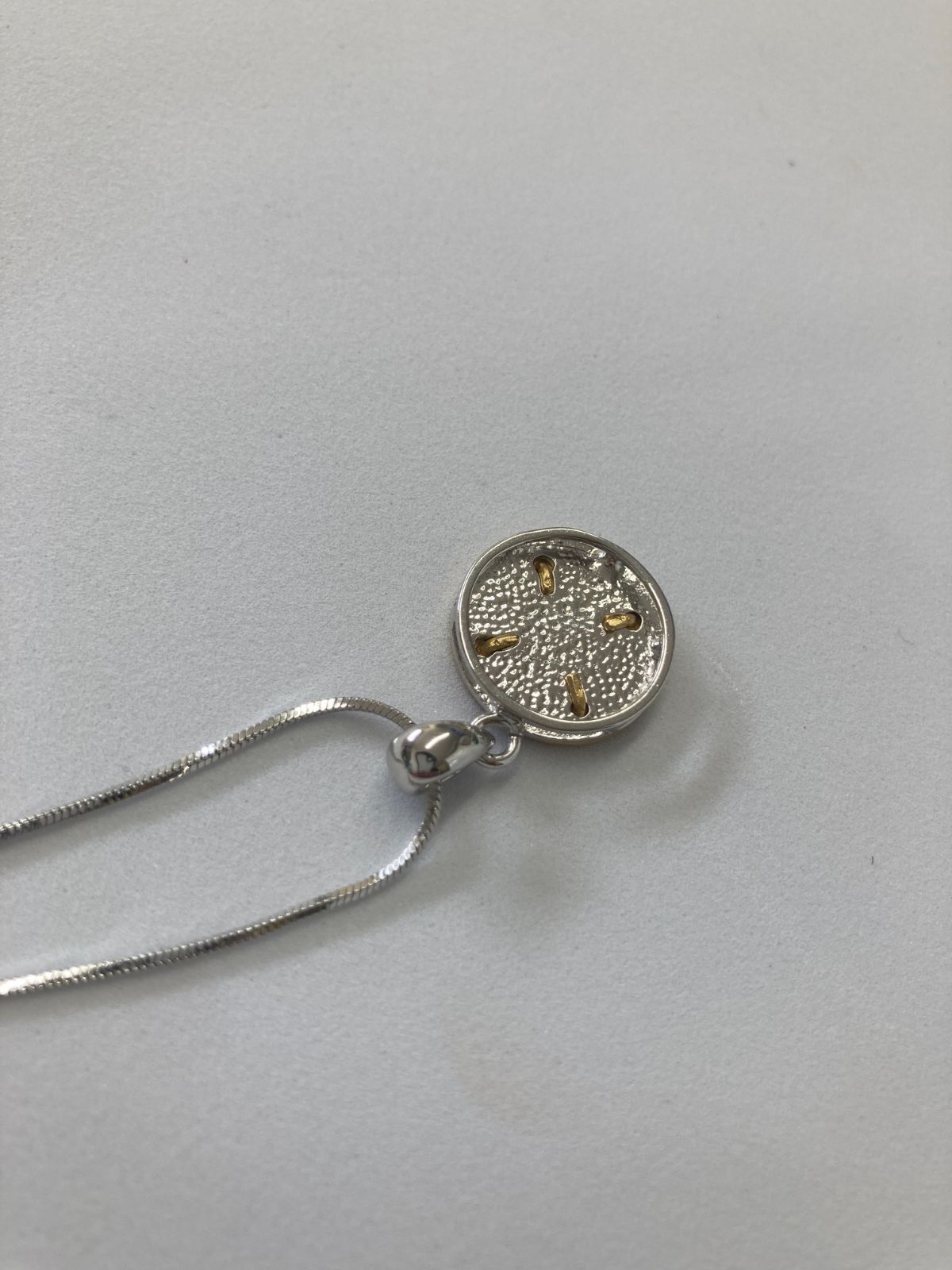 ②銀色のチェーンに丸いペンダントトップが付いております。