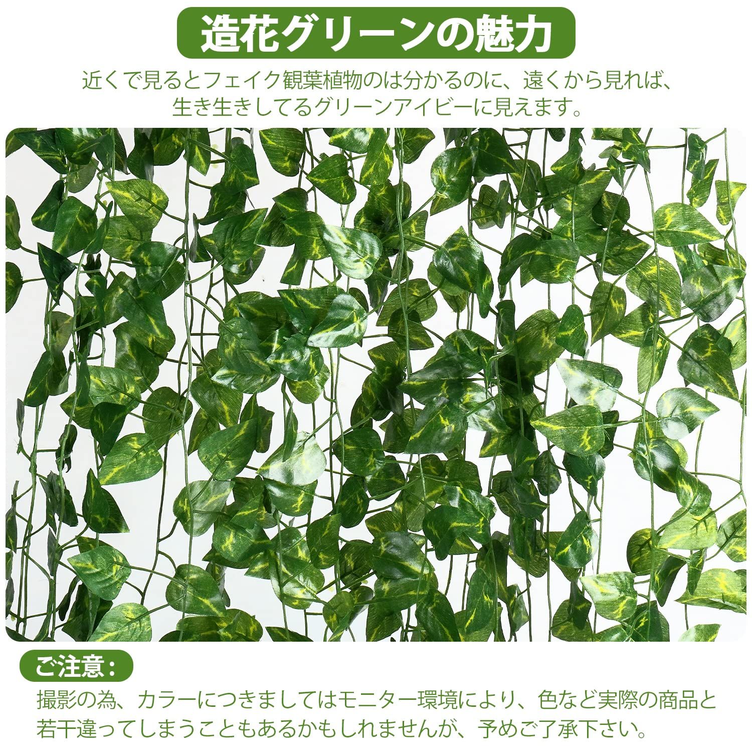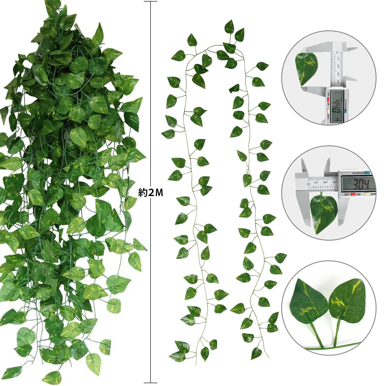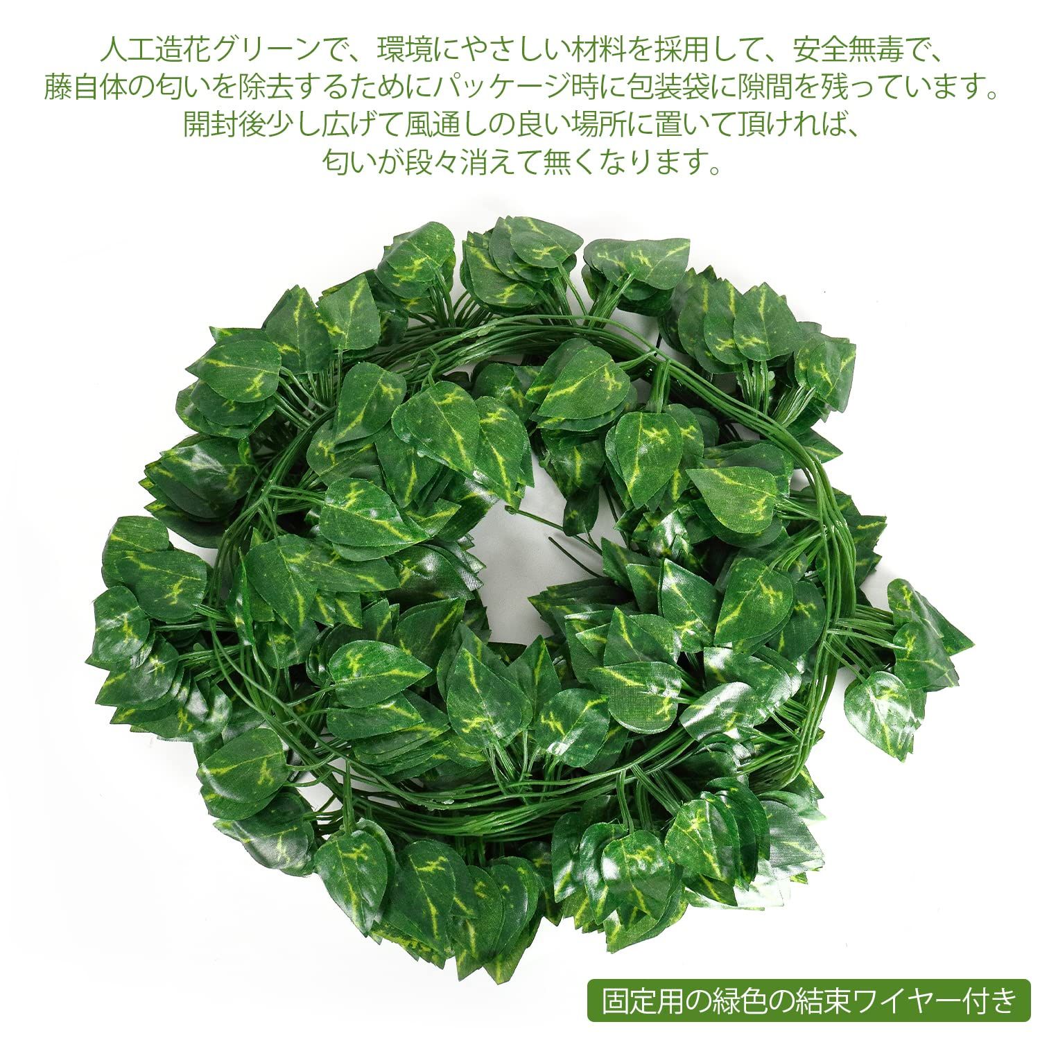 仕様概要:フェイクグリーンは24本入り、12本づつ束になって、長さは2メートルで、1本毎に約80枚の葉っぱは茎の左右に均一に分布しています。葉っぱは特別のハート形状で超可愛いです。何箇所に分けて使え、何本に合わせて飾り付けるとより雰囲気を出せます。