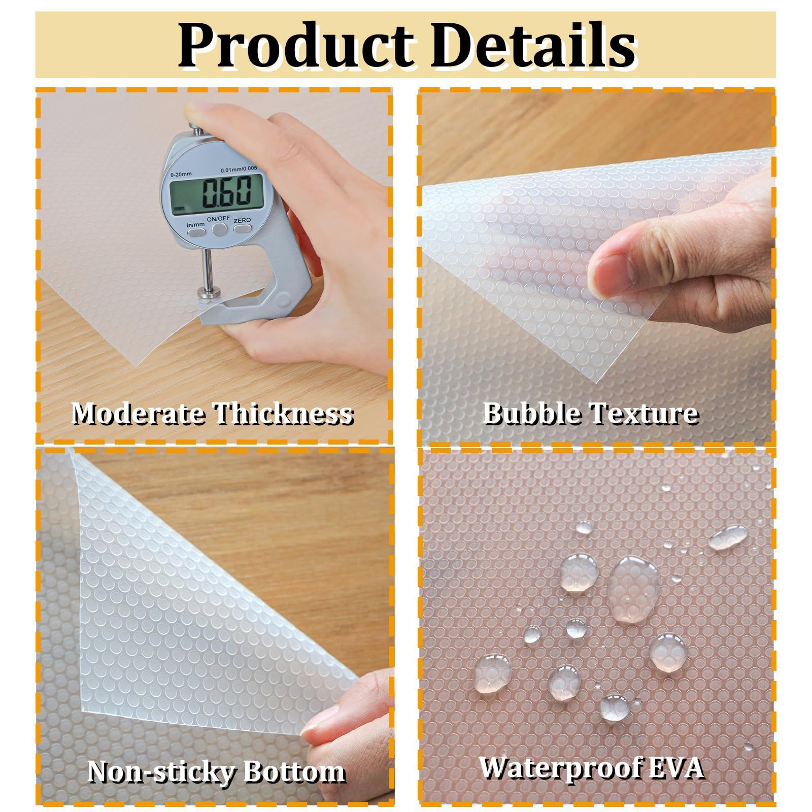 [高品質の食品グレードのEVA素材] 食器棚シートは耐久性と再利用性に優れた高品質食品級のEVA - エチレン酢酸ビニル素材を使用しているため、耐久性、再利用性に優れています。EVA素材は防水性が高く、弾力性と柔軟性を兼ね備えています。