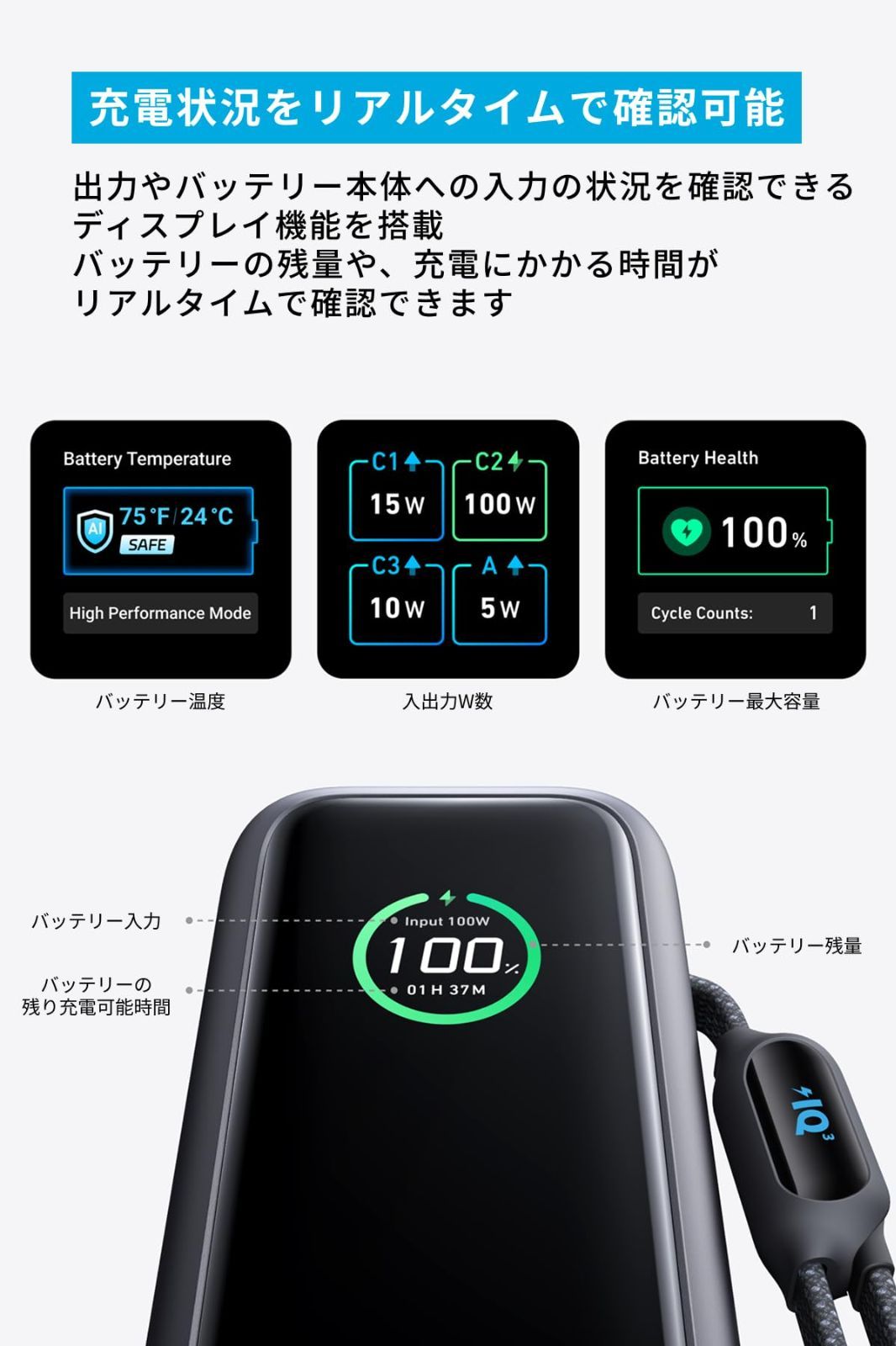 最大100Wでの急速充電:3つのUSB-Cポートからそれぞれ最大100W出力が可能です。MacBookシリーズを含む様々な機器へ急速充電できます。