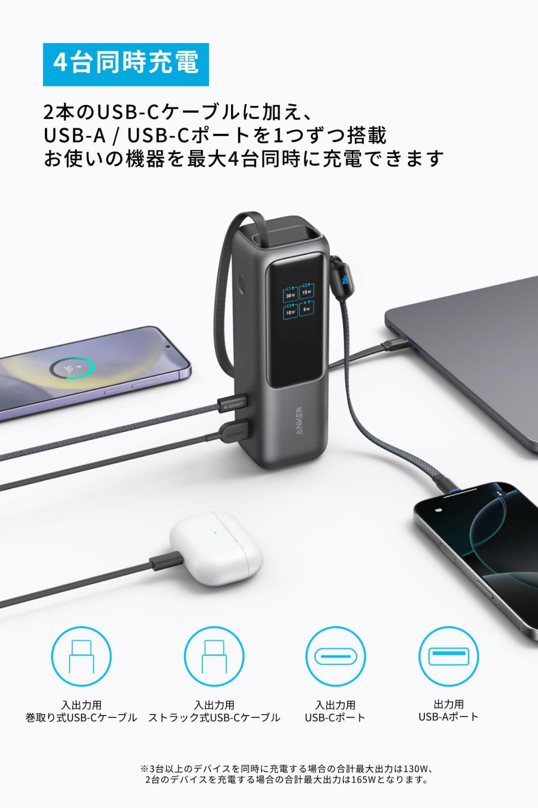 Anker Power Bank (25000mAh Built-In & 巻取り式USB-Cケーブル) 【PD対応/PSE技術基準適合/USB-C入力対応 / 165W出力 MacBook PD対応Windows PC iPad Pro iPhone 16 / 15 Galaxy Android スマートフォン ノートPC 各種 (ブラック)