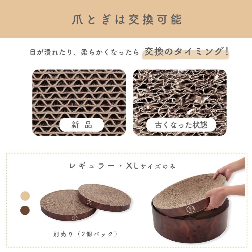 【つめとぎ部分は交換可能。長く使えるつめとぎ】つめとぎダンボール部分のみ交換用を2個セットで販売しております。 はつめとぎ部分のみ交換できるので、経済的です。 交換も、枠組み底面に空いた穴から手でポンとつめとぎ部分を押して取り出してあげるだけ。 とっても簡単に交換できます。