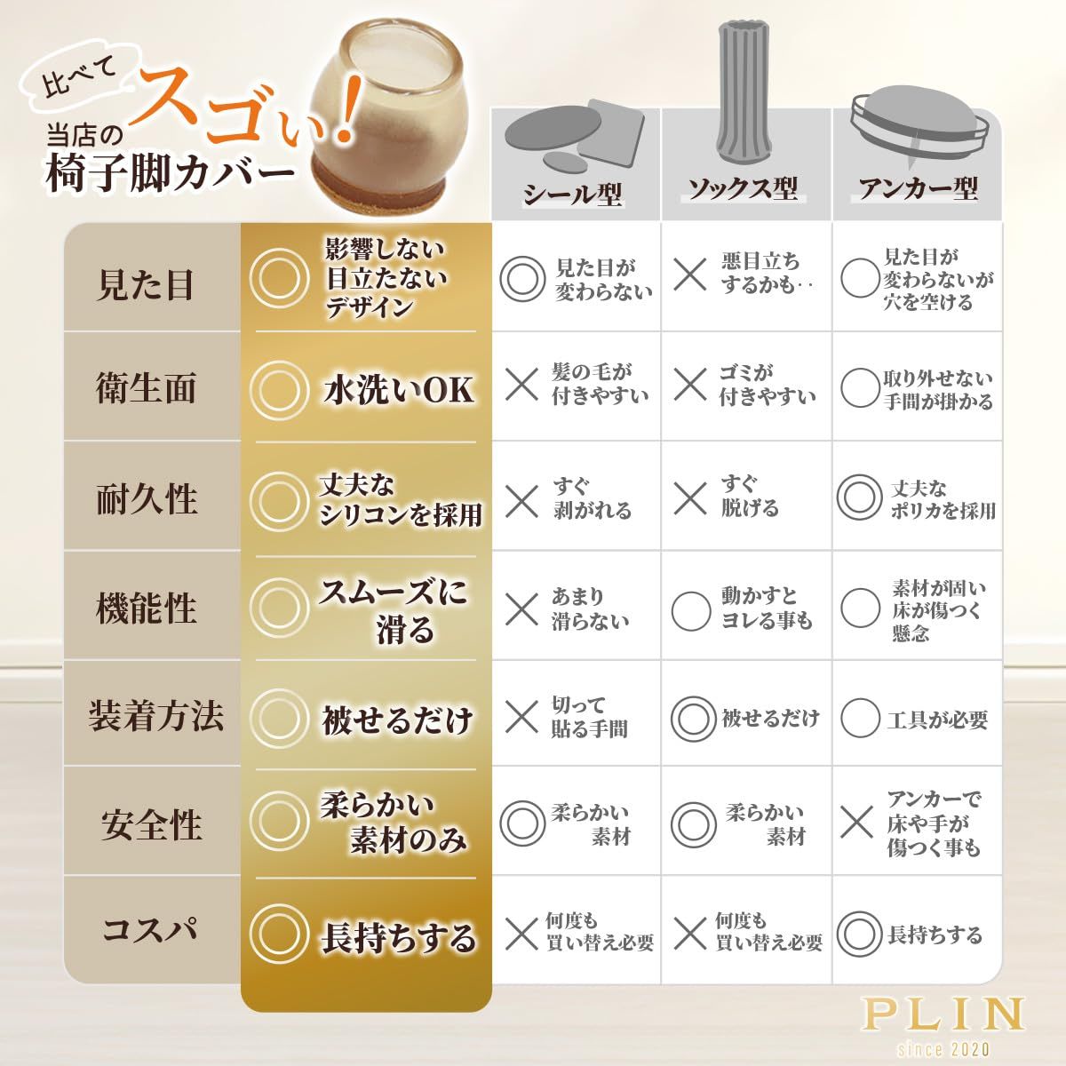 ・シリコンの素材で作られ、脚をしっかり包み込むことで、椅子を動かしたときの摩擦を抑え、スムーズな動きをサポートします。