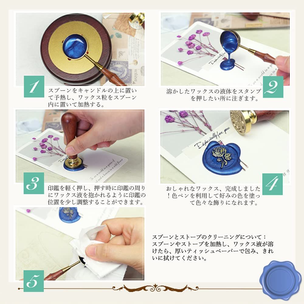【高品質の品物】セットの内容はすべて高品質の製品を選択します。ワックスビーズは安全で無毒なパラフィンと松脂を加工して、印章頭が良質な黄銅エンボス印章頭で、ストーブ・ハンドル・スプーンが全部良質なケヤキと鉄を選んで作って、長く焼いても壊れません。付属の離型パッドも食用級シリカゲルを選択し、手作りしないときはコースタとしても使用できますよ。