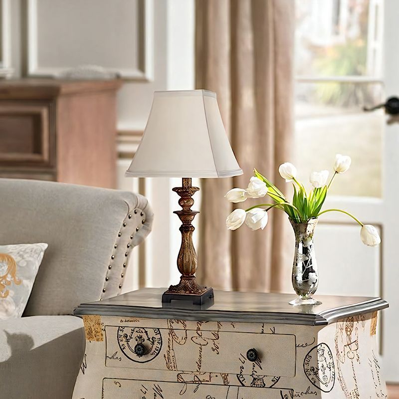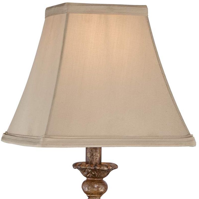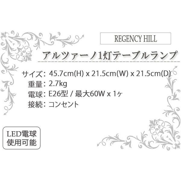 本体素材: 合成樹脂|フィニッシュ: ブロンズ|シェード: 布製|シェード: 19cm(H) x 21.5cm(W)|重量: 2.7kg|口金: E26型|電力: 最大60W x 1|LED電球: 使用可能|接続: コンセント|スイッチ: コード内(ロータリースイッチ)