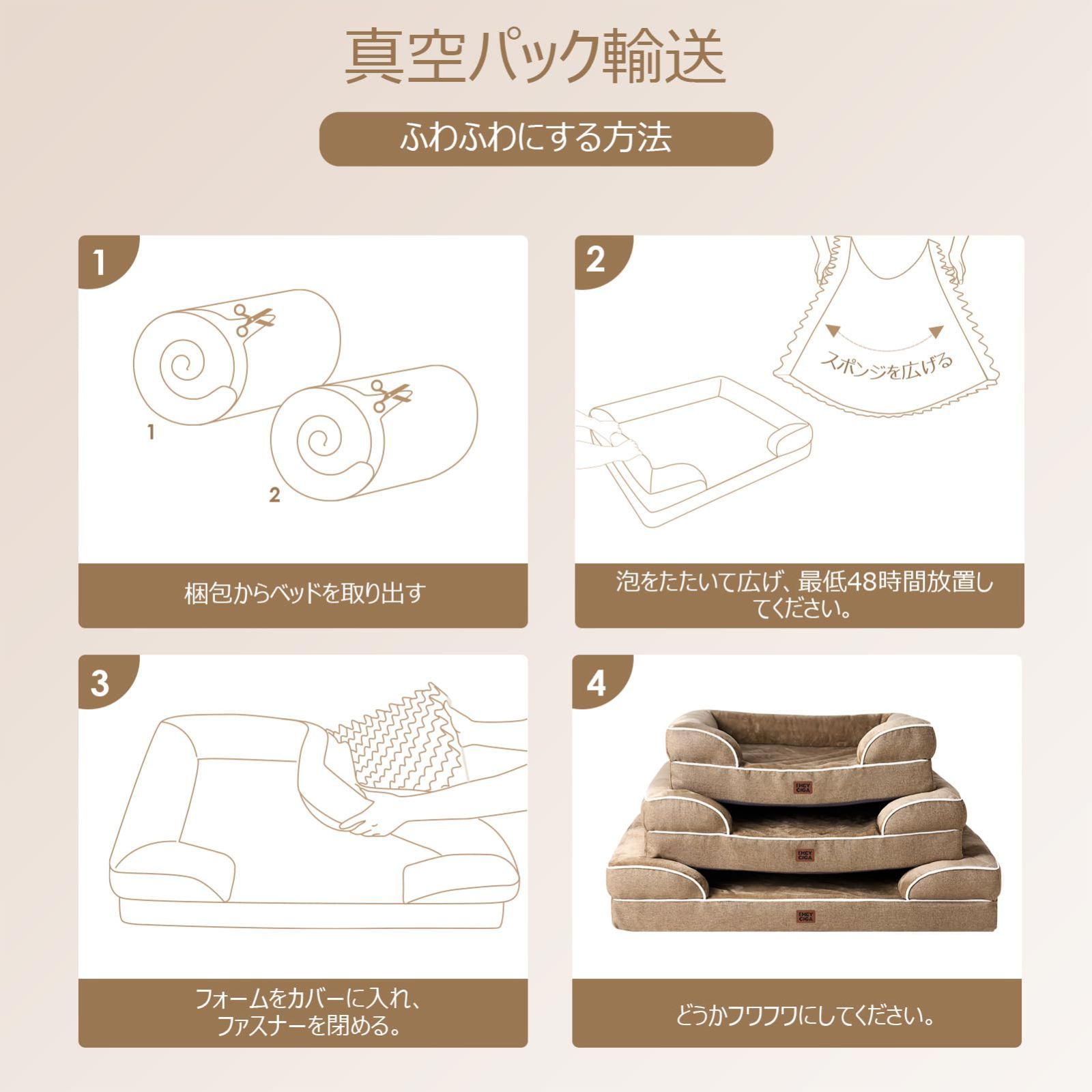お手入れ方法:当社の犬用ベッドには、取り外して洗えるカバーが付いています。カバーは中材を取り外せば洗濯機で丸洗い可能です。ただし、中材のフォーム自体は洗えませんのでご注意ください。開封後は24~48時間ほどで元の形に膨らみます。