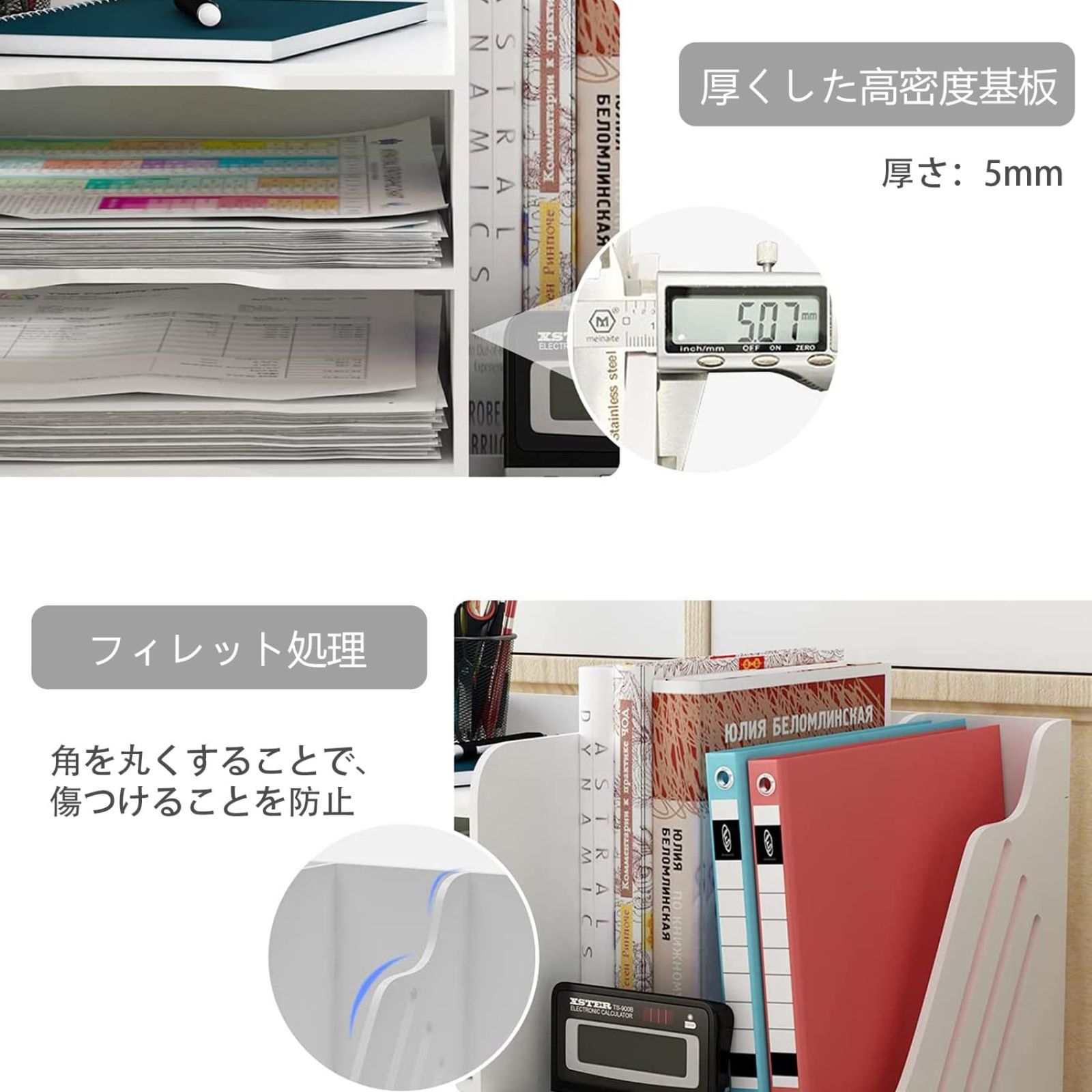 【細部にこだわり】机上書類整理ラックの棚板はアーク凹みデザインを採用しており、ファイルの取り出しが便利になります。中空構造で、書類をより識別しやすくするだけでなく、通気性を確保し、湿気から保護することもできます。