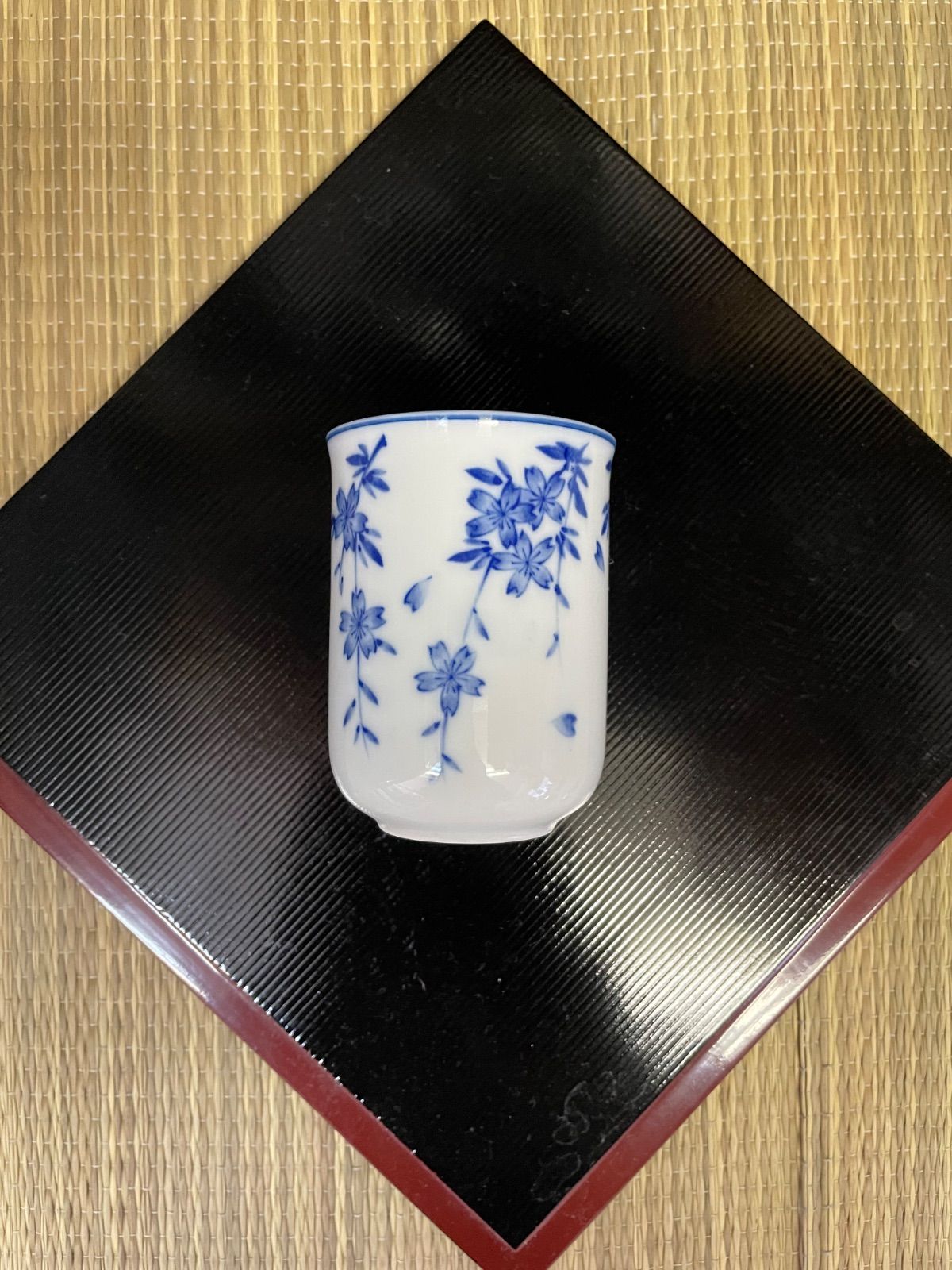 湯呑み 桜に三ツ桜紋 白地に紺の桜の花柄と三ツ桜紋柄