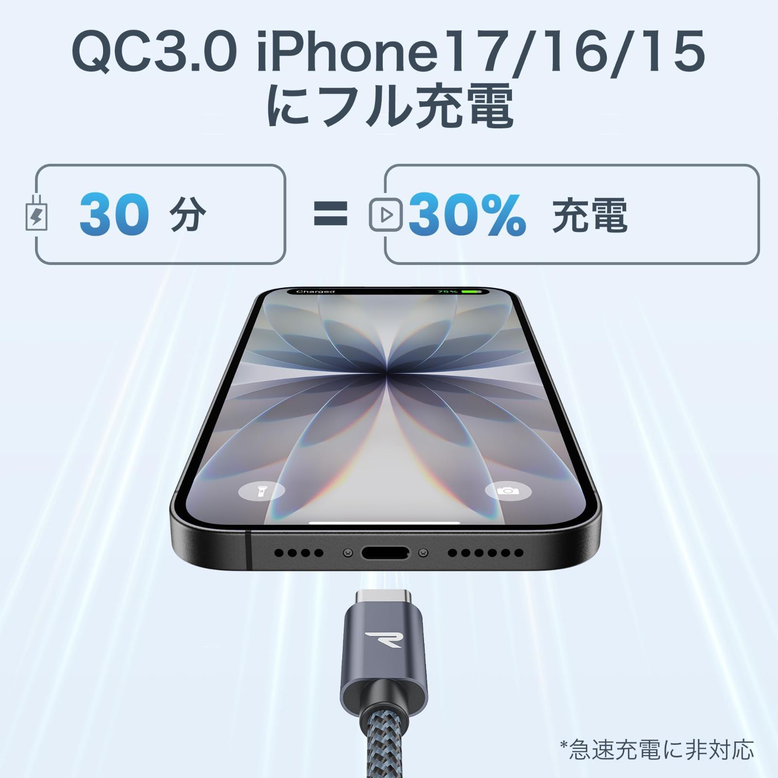【快適なフルスピード充電】iPhone 17/16/15シリーズのスマートフォンを充電する場合、充電電力は12Wで、急速充電には対応していません。 当社のUSB CケーブルはQC3.0対応、3.6V5V/3Aのフルスピード充電が可能です。▲充電器と充電機器がQC3.0対応している場合に限ります。※ iPadとMacbookに充電する際に、15W以上のUSB-A充電器の使用を推奨いたします。