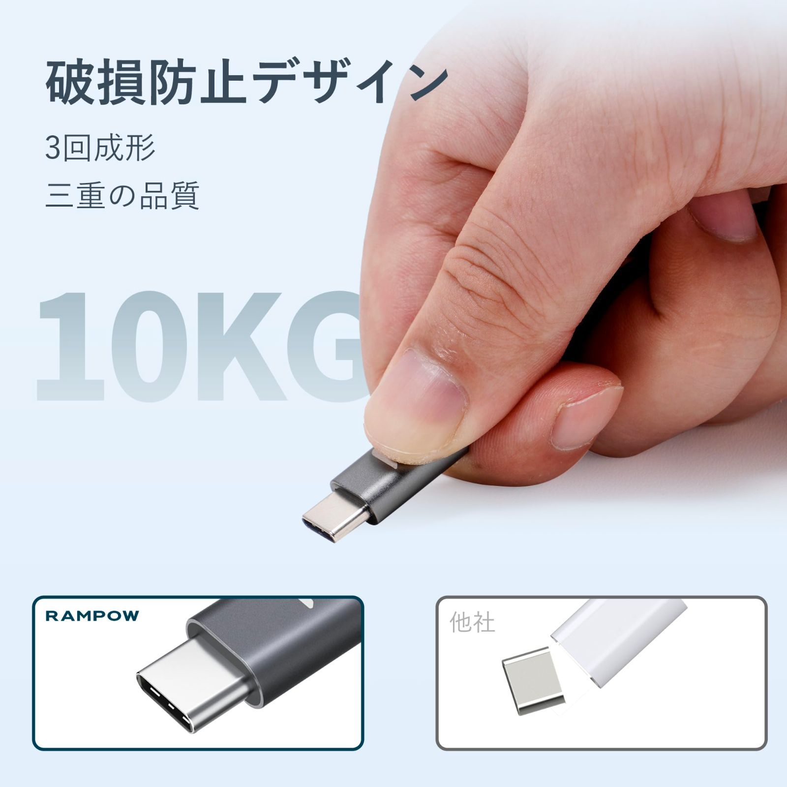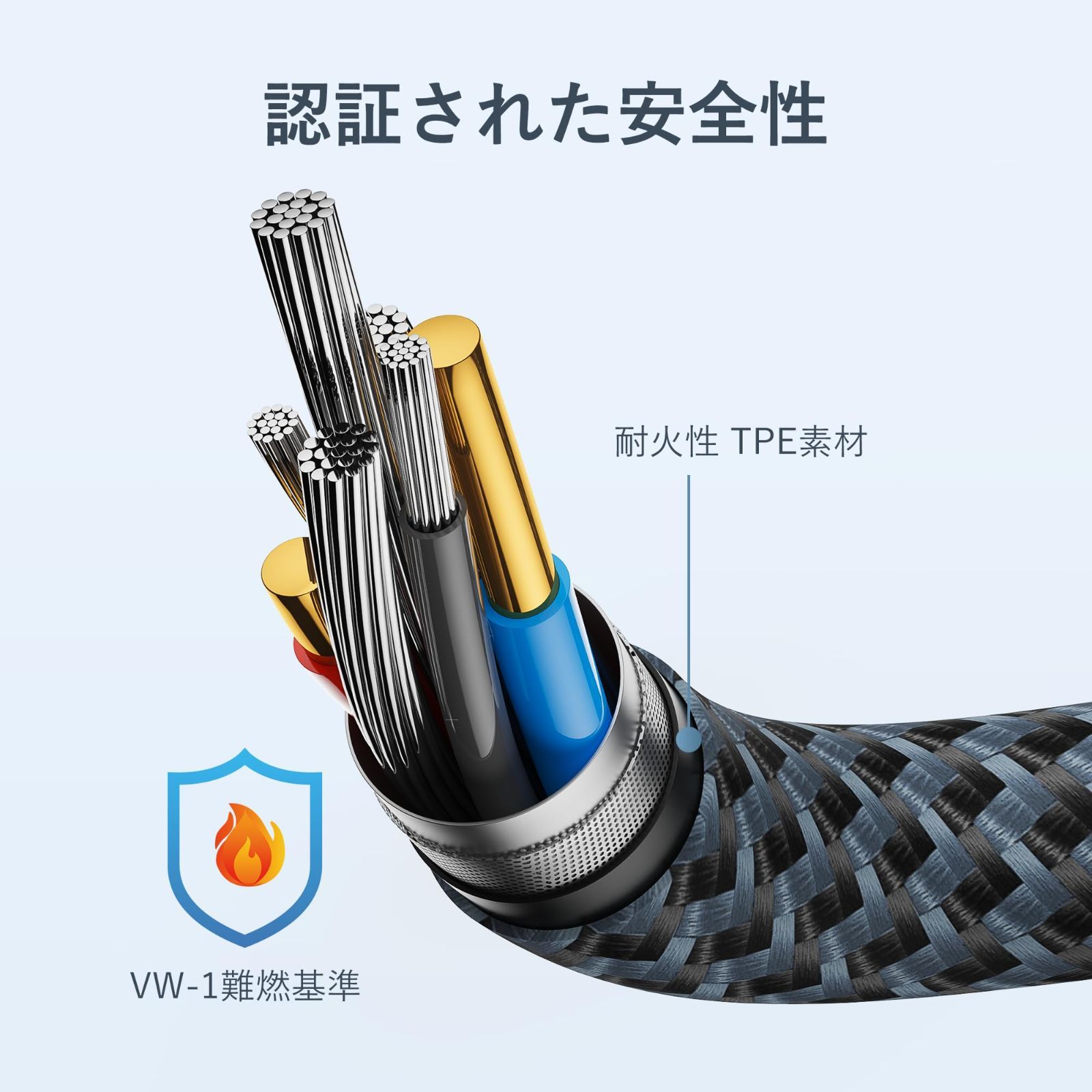 【安全な保護機能搭載】過充電、発熱と短絡を防止する機能を搭載し、安定性の高い急速充電と大切な機器の損傷防止を実現します。サビなどに強く信号劣化を抑える金メッキピンと難燃性の素材を採用し、安全性を高めています。