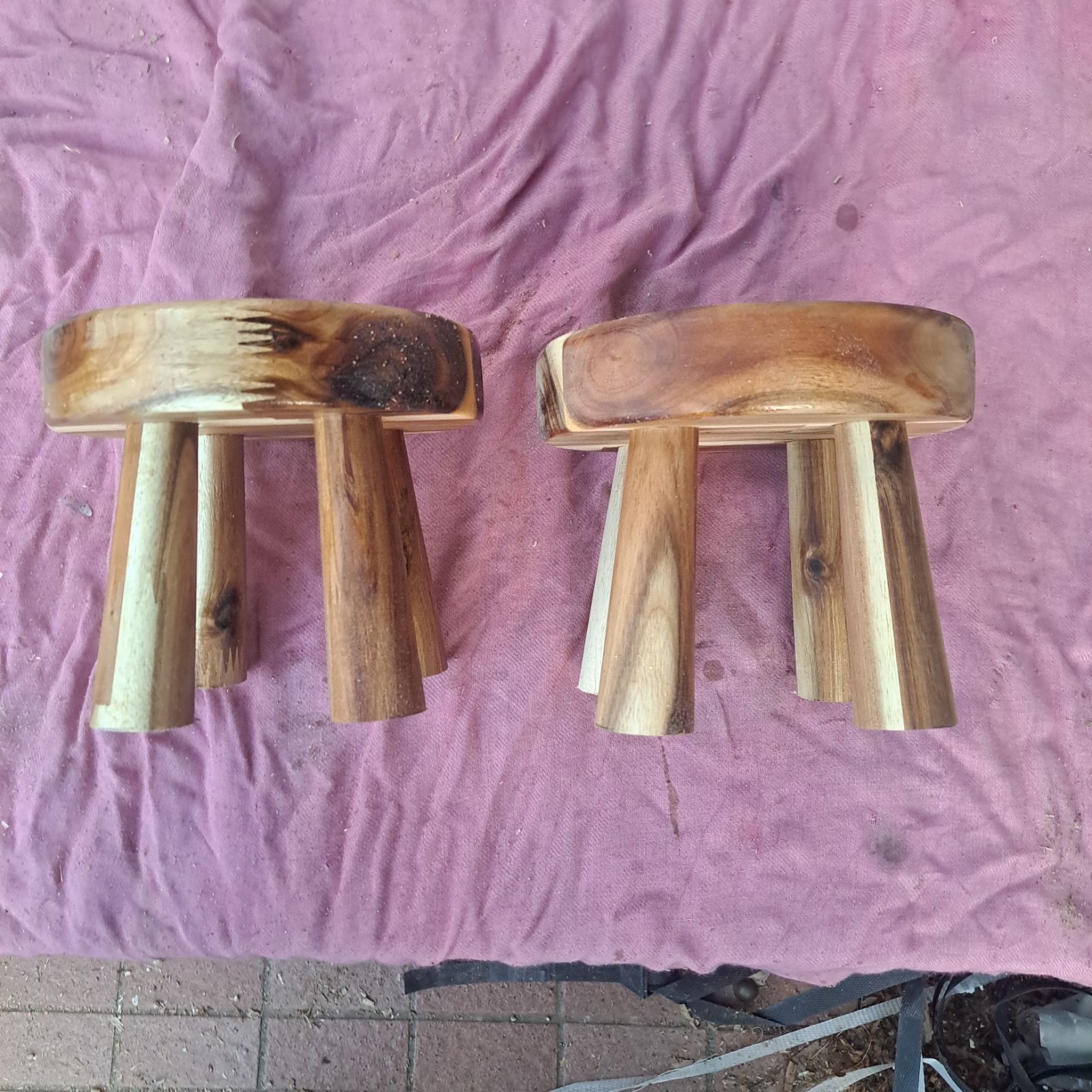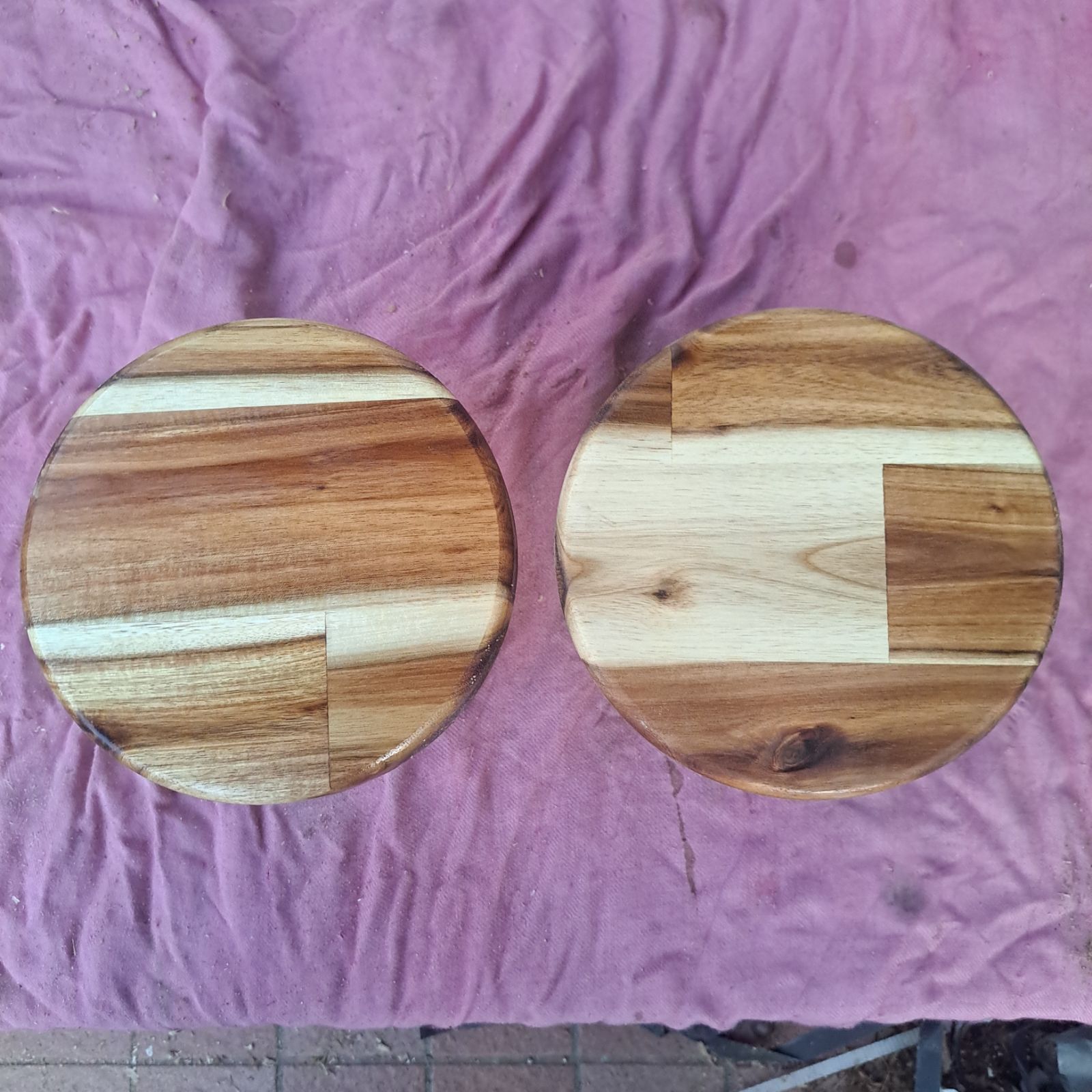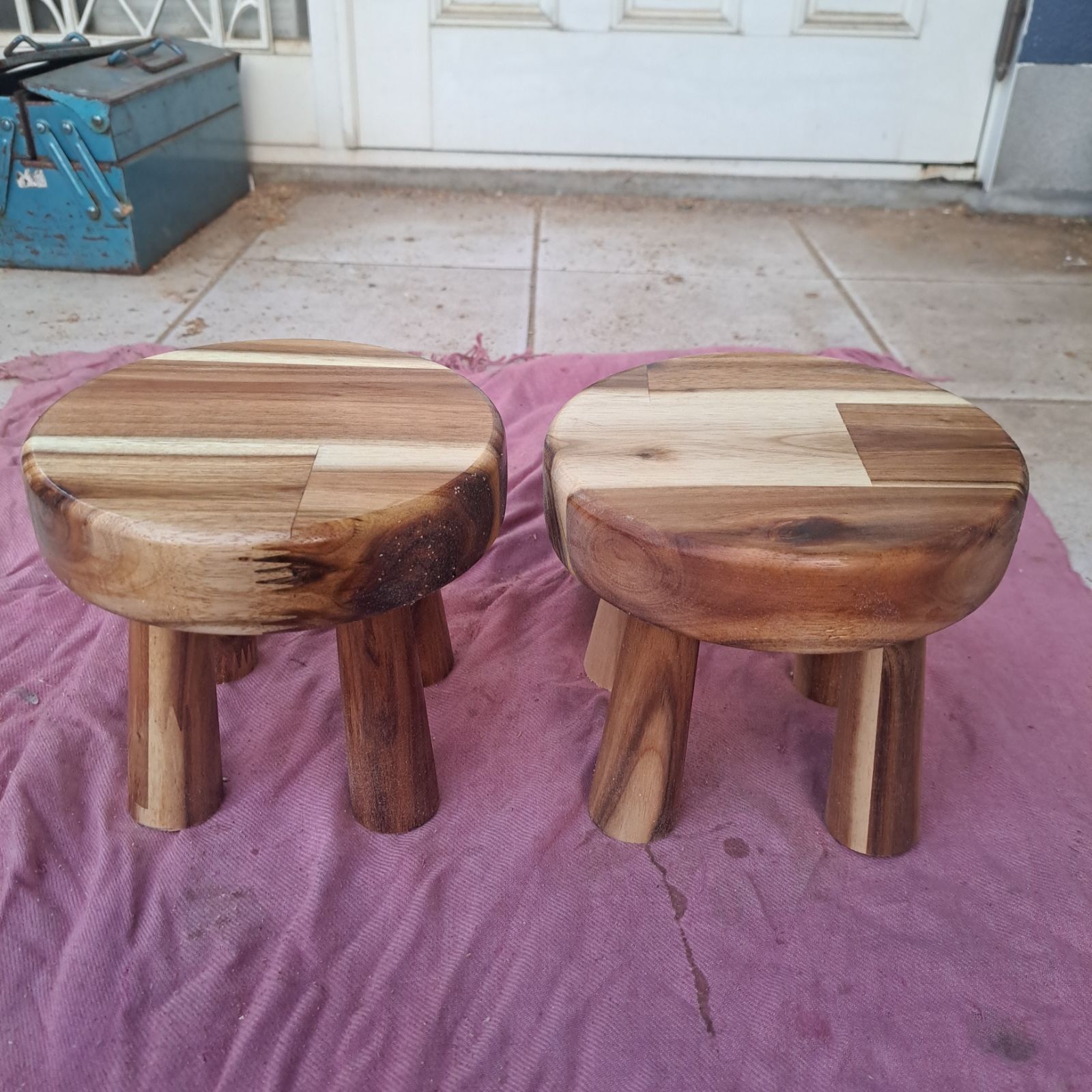 趣味で木工してます。 アカシアと言う高級家具材の集成材が手に入りました。 座面は直径175mm厚さ40mmです。 足は通常と逆に末広型にして見ました。太い処の直径は38mmです。 座面の高さは150mm(およそです)仕上げはウレタン仕上げです。 ※発送前にはガラス面上でガタツキ調整して発送しますが設置環境が変われば多少ガタツキが出るかもしれませんが、その場合にはフェルト等貼り付けで調整してください。 玄関 屋内下駄箱の上等インテリアに如何でしょうか?木製品なので雨の当たる所は苦手です。 素人の手作り品で節や割れやの穴埋めや塗装むらや足の太さのばらつきはありますが、それも手作り感とご理解下さい。依って家具屋さんで見るような高級家具と比較されては困ります。 鉢植え ぬいぐるみ 小物雑貨等オシャレに飾ってお楽しみ下さい。 構造的には本格的ほぞ穴加工で組み立てていますが、目的以外の使用は避けて下さい。 がっちり太い材料で作っていますので子供椅子としてもお使い頂けます。