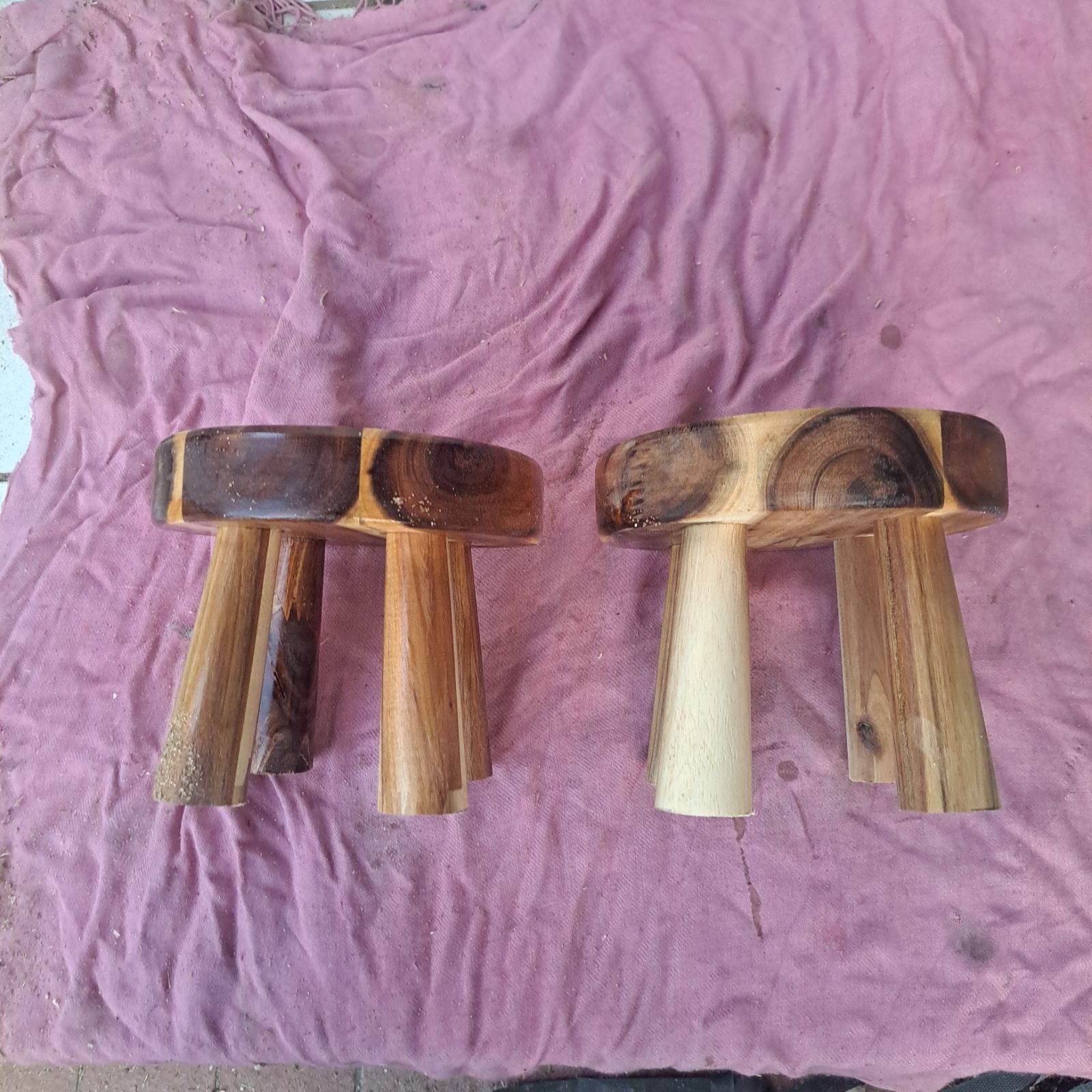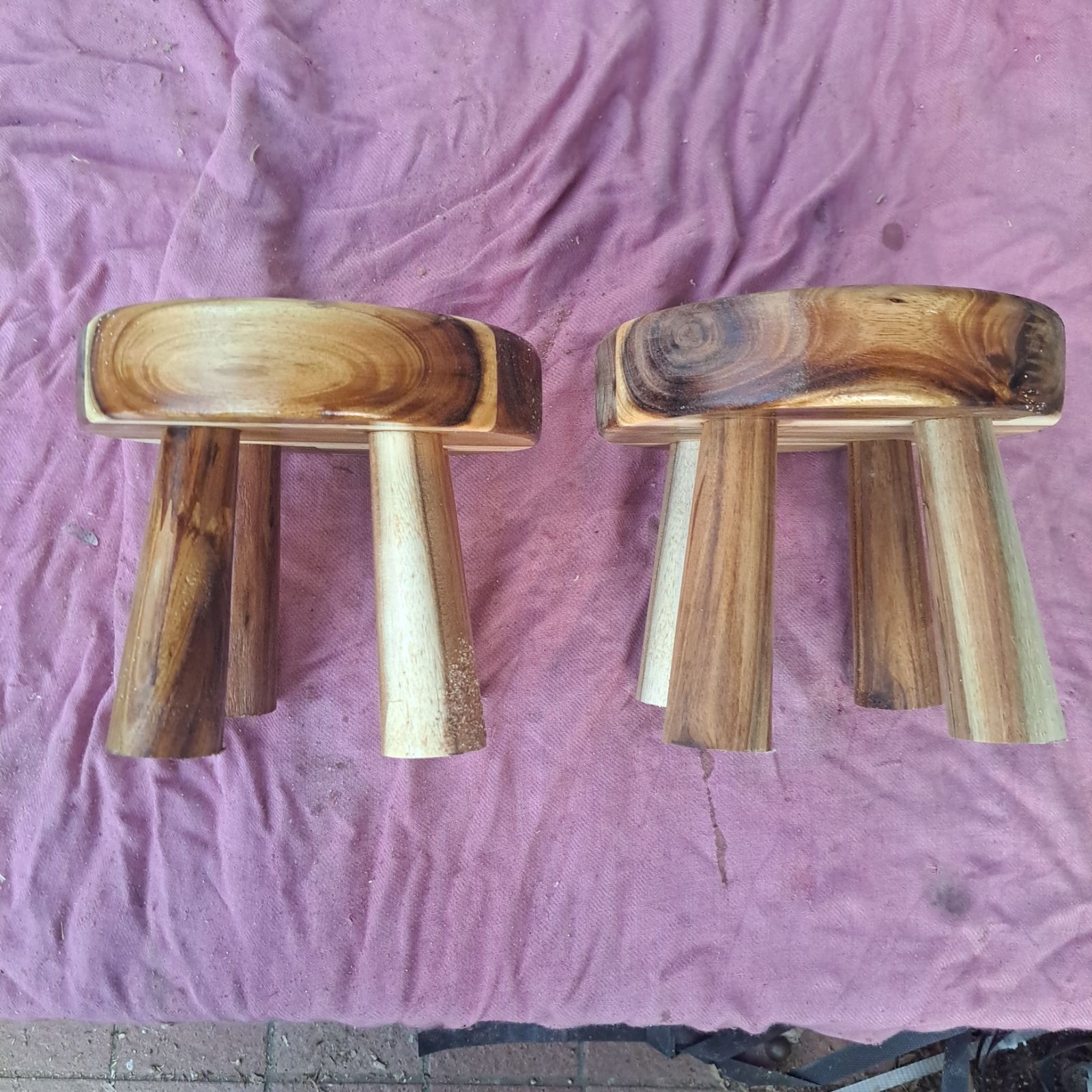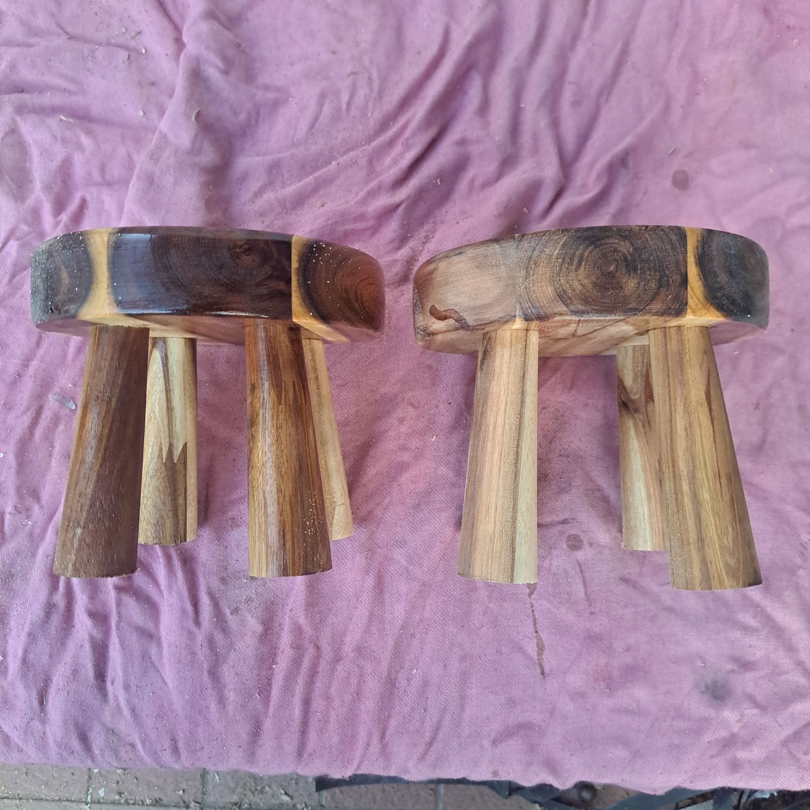 趣味で木工してます。 アカシアと言う高級家具材の集成材が手に入りました。 座面は直径175mm厚さ40mmです。 足は通常と逆に末広型にして見ました。太い処の直径は38mmです。 座面の高さは150mm(およそです)仕上げはウレタン仕上げです。 ※発送前にはガラス面上でガタツキ調整して発送しますが設置環境が変われば多少ガタツキが出るかもしれませんが、その場合にはフェルト等貼り付けで調整してください。 玄関 屋内下駄箱の上等インテリアに如何でしょうか?木製品なので雨の当たる所は苦手です。 素人の手作り品で節や割れやの穴埋めや塗装むらや足の太さのばらつきはありますが、それも手作り感とご理解下さい。依って家具屋さんで見るような高級家具と比較されては困ります。 鉢植え ぬいぐるみ 小物雑貨等オシャレに飾ってお楽しみ下さい。 構造的には本格的ほぞ穴加工で組み立てていますが、目的以外の使用は避けて下さい。 がっちり太い材料で作っていますので子供椅子としてもお使い頂けます。