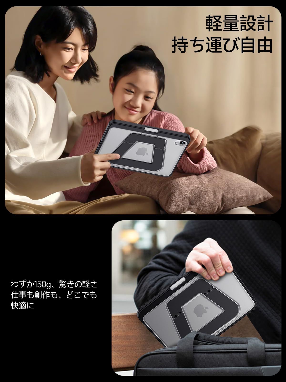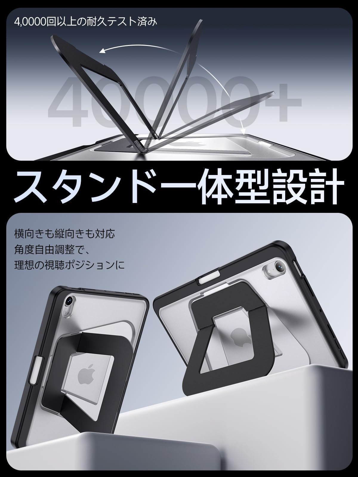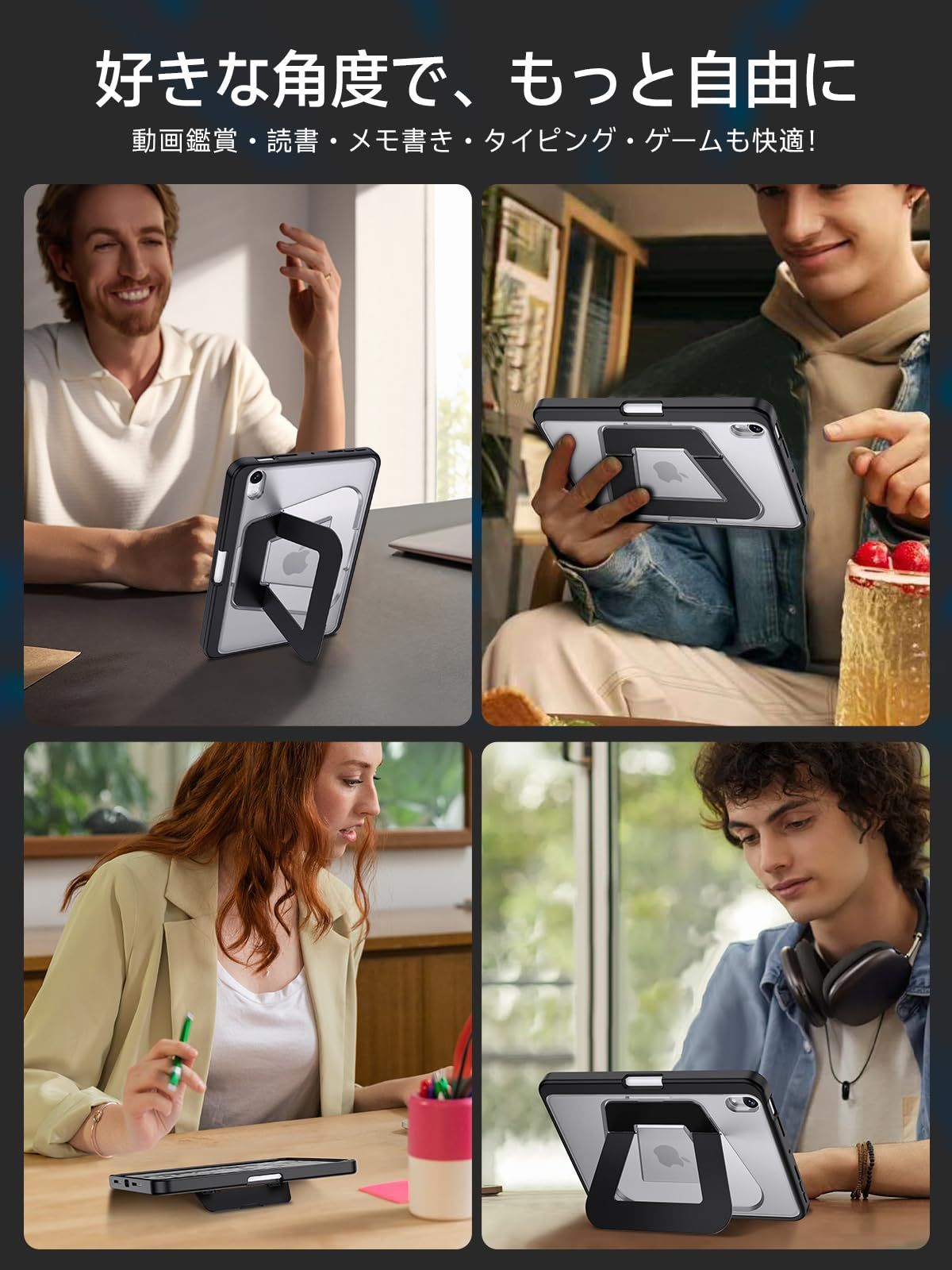 【自由に角度調整できる多機能スタンド】:独自の二軸スタンド構造により、使用シーンや姿勢に合わせてスムーズに角度調整が可能です。ショートスタンドは1540°の低角度に対応し、メモ書きやタイピング、イラスト作業にぴったり。ロングスタンドは30100°まで調整でき、動画視聴や資料作成などの作業にも快適に使えます。さらに、縦向き80°のスタンド機能も備えており、読書やビデオ通話など、両手を自由に使いたいときにも便利。無理のない姿勢で作業できるため、肩や首への負担も軽減されます。