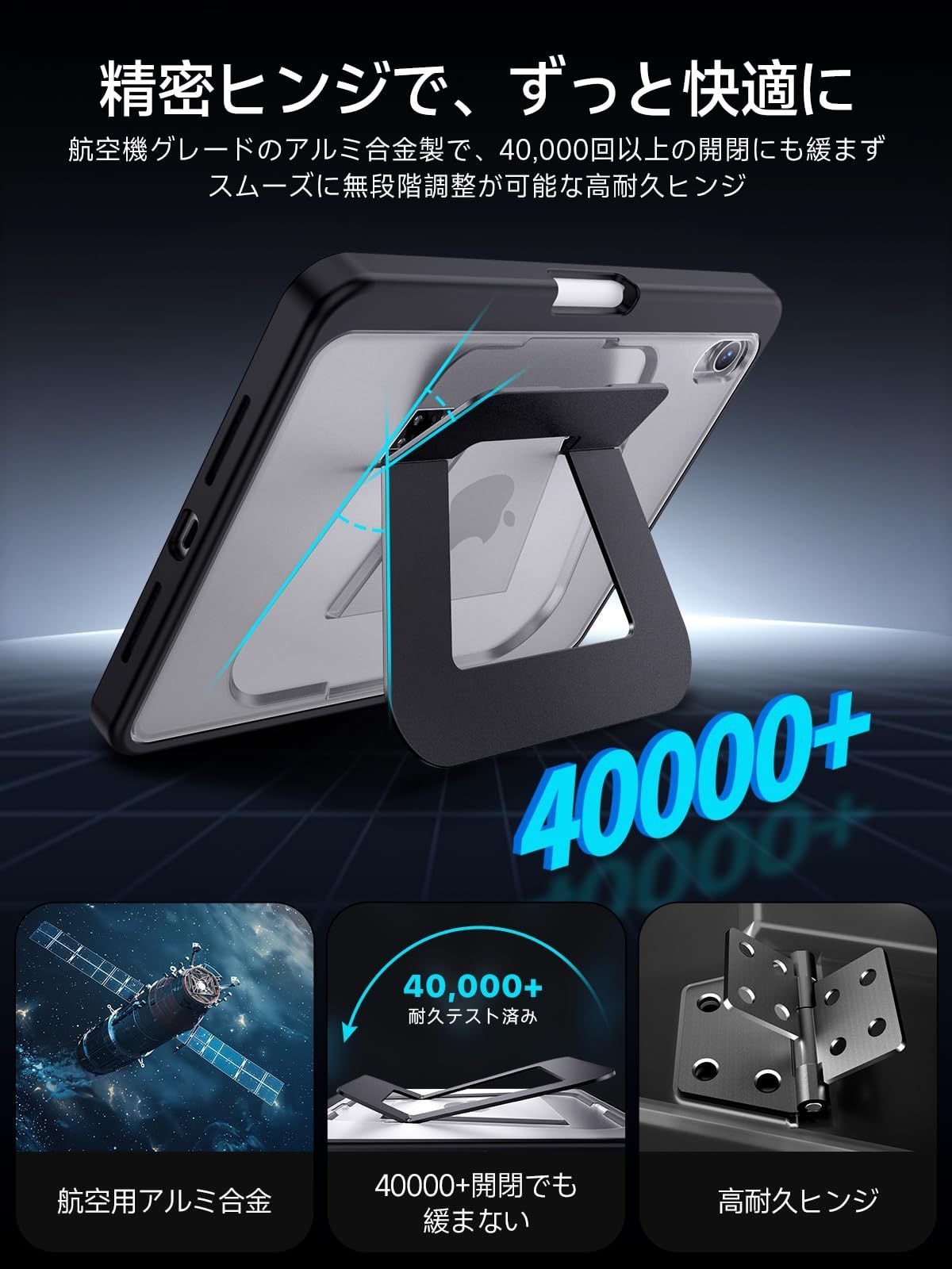 【安定感のある設計で、作業に集中】:HEIGKOIK iPad mini7 ケースは、日常使いに求められる「安定性」と「使いやすさ」を考えて設計されています。スタンド部分には航空機グレードのアルミニウム素材を使用し、独自の「トラホールド」ヒンジ構造により、約40000回の開閉テストをクリア。タイピングや動画視聴中でも、ぐらつきにくく、しっかりと自立します。従来のレザーケースで感じやすい不安定さを抑え、より快適な作業環境をサポートします。