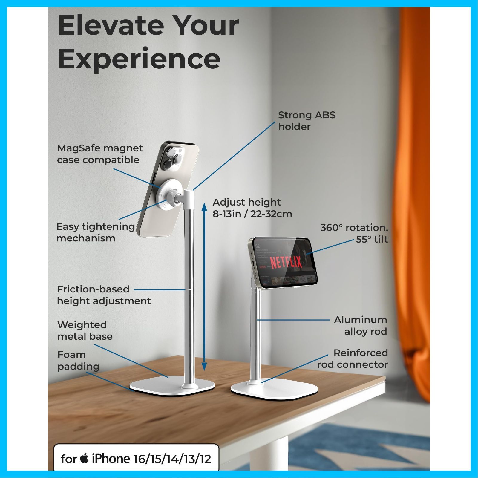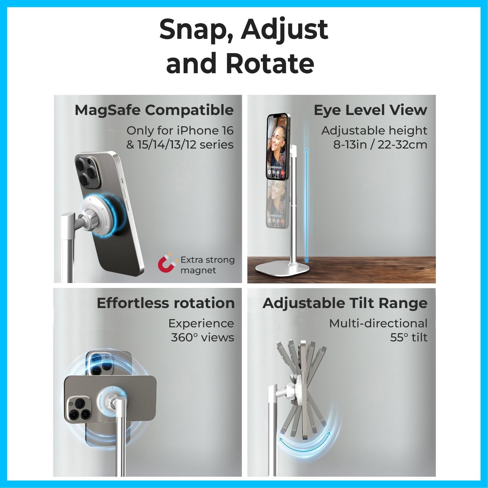 目の高さで快適に このマグセーフ対応スマホスタンドは、813インチ(約2233cm)まで高さ調節が可能で、360°回転と55°の傾斜調整ができます。動画鑑賞や読書、ストリーミング時の首や背中の負担を軽減し、最適なカメラアングルをキープします。