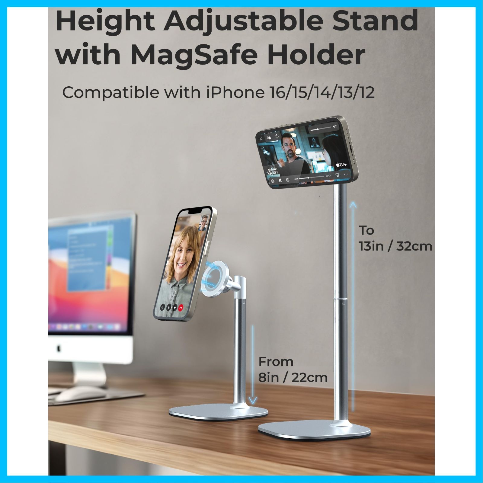 デスクにぴったりなMagSafe対応スマホスタンド iPhone 15 (Pro Max Plus)/14/13/12シリーズに最適な、磁力で簡単に取り付けられる高さ調節可能なスマホホルダーです。撮影、FaceTime、Zoom、Facebook Live、TikTok、勉強などに最適です。