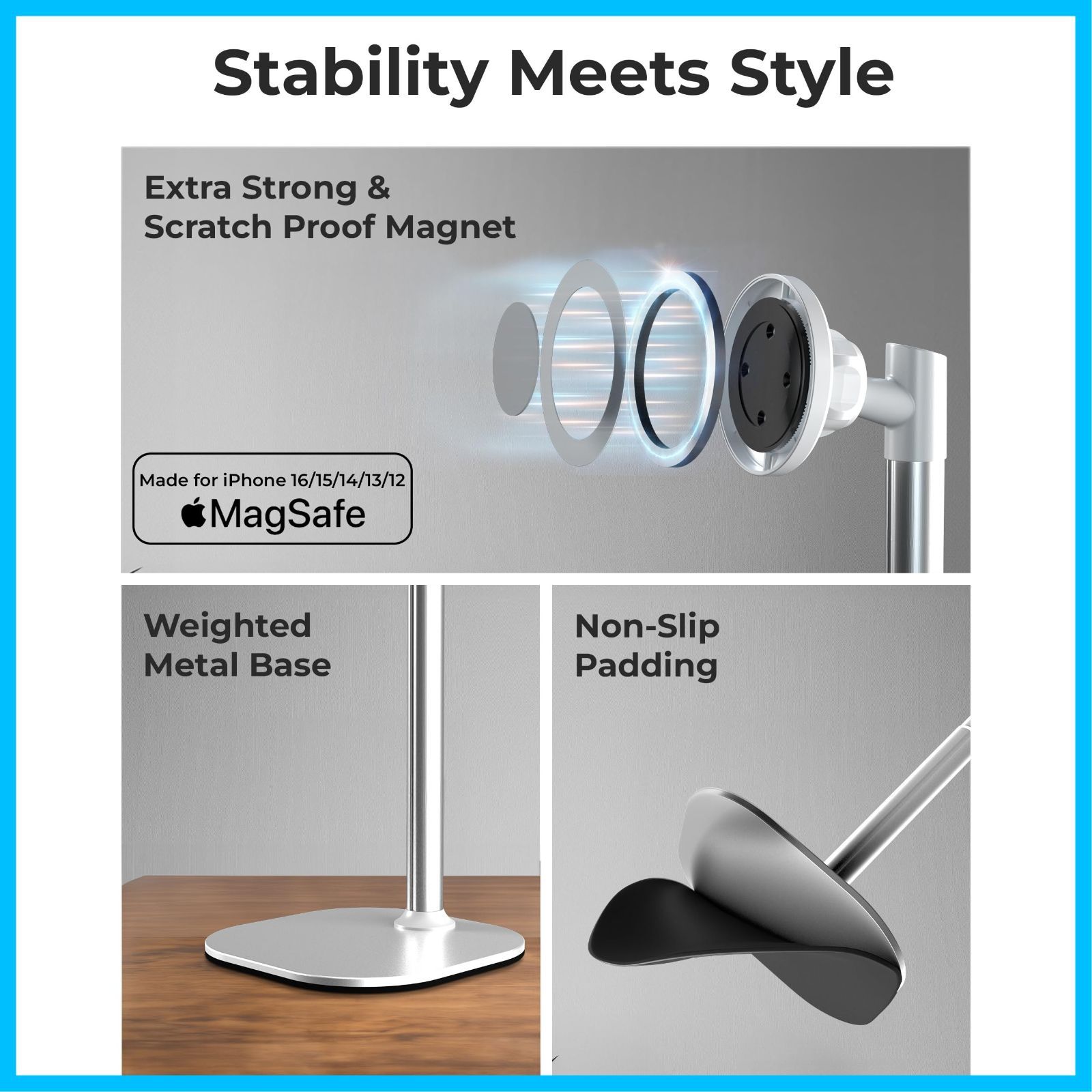 抜群の安定性 安定感抜群の広くて重みのある金属製のベースと滑り止めパッドを採用。揺れても倒れない強力な磁力で、iPhoneをしっかり固定します。