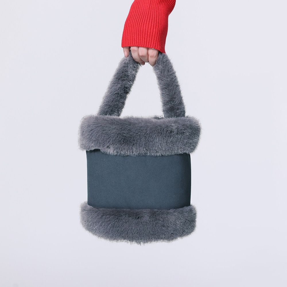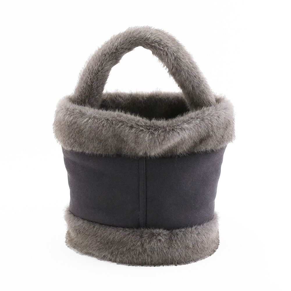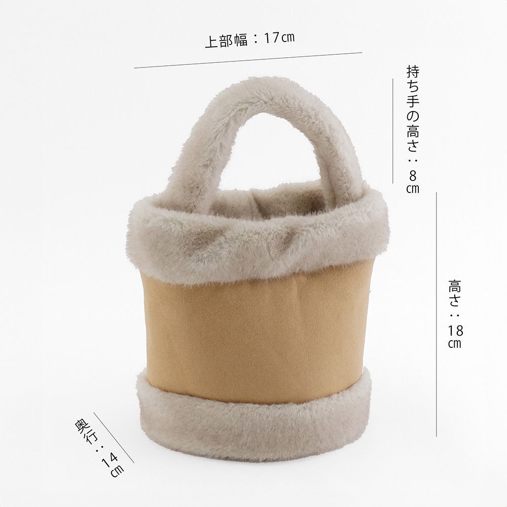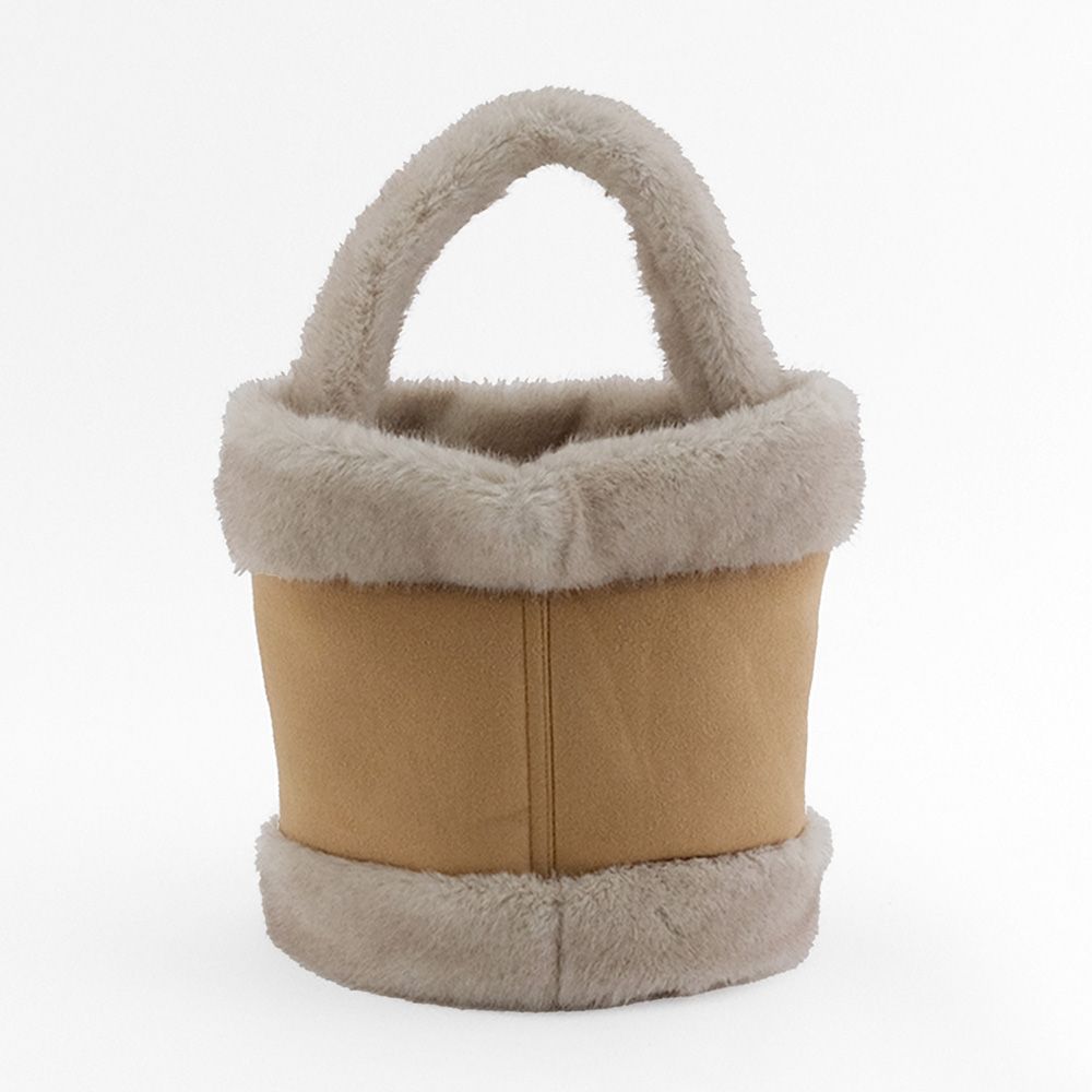 シーズンムードが高まるフェイクムートンのバッグ。トリミングとハンドルに使用したミンク調のファーがポイント。見た目にボリュームがあるので、サイズはあえてコンパクトに仕上げています。底マチがあるので、財布にスマホ、ちょっとした化粧品を入れるには問題ありません。デニムなどのカジュアルスタイルと相性◎です。
