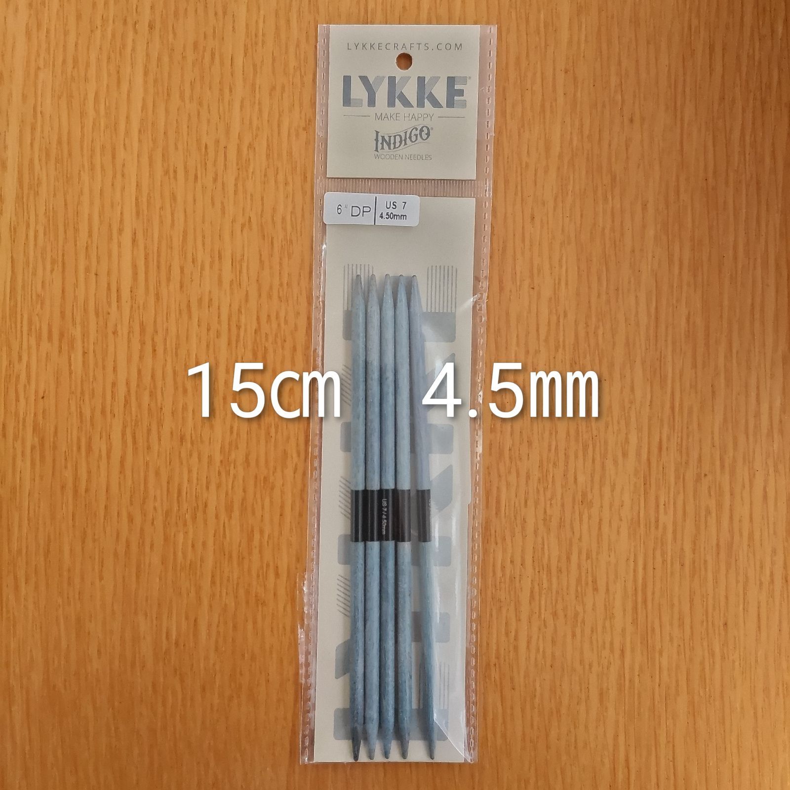 編み針メーカーLykkeリッケのIndigo 15㎝ 6インチ 4.5㎜木製5本針です(^^)。