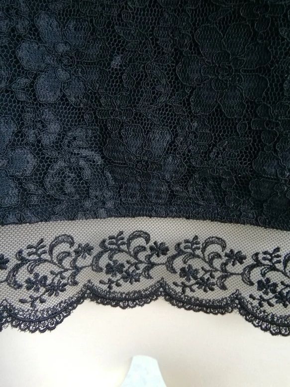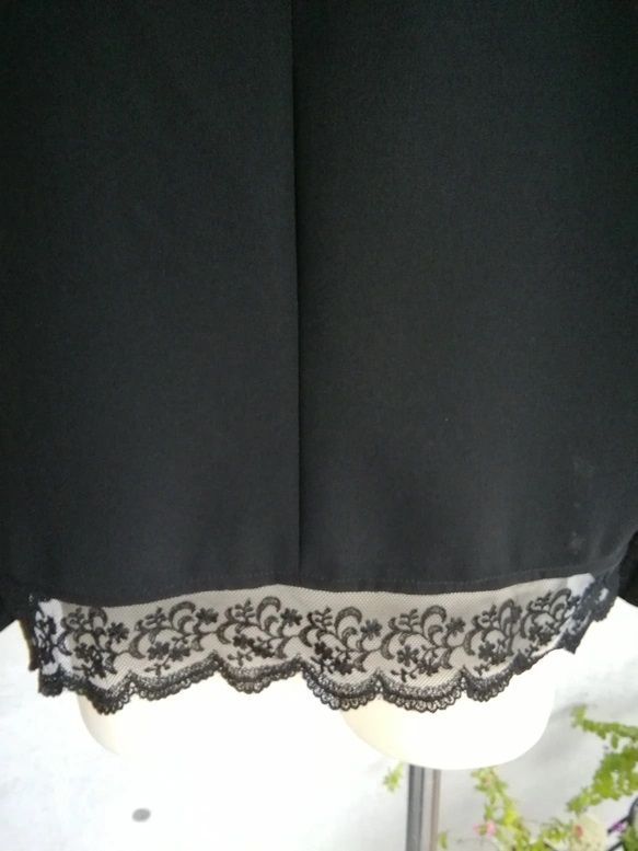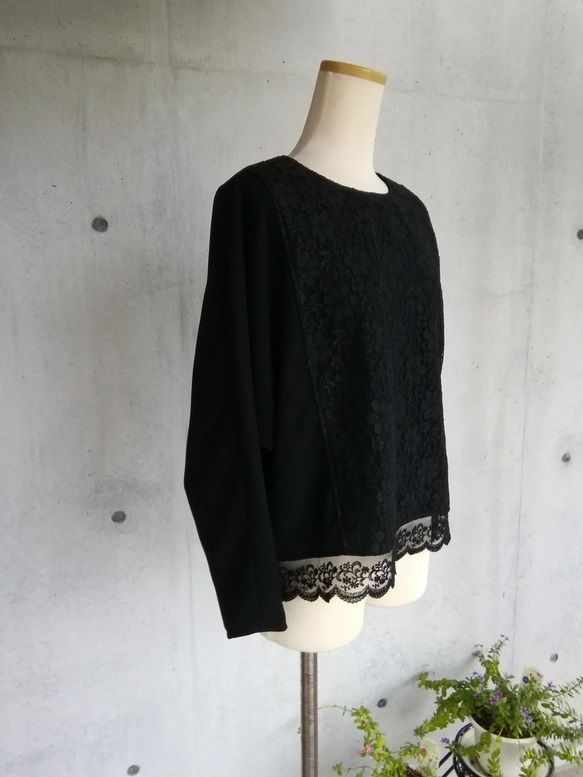 ゆったりだけどすっきり見えて、どんなボトムにお合うレース使いドルマンスリーブのブラウス、ブラックフォーマルで登場です。