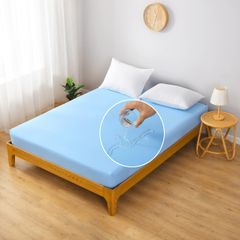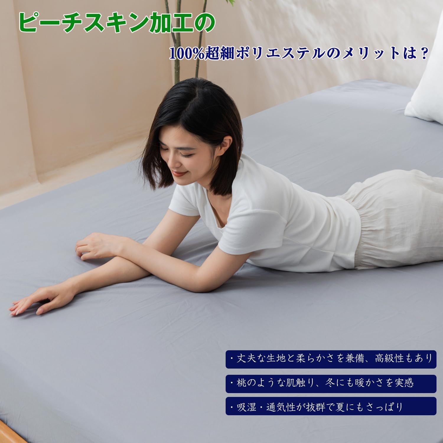 「超極細繊維のピーチスキン加工で、至高の肌触りを実現」このボックスシーツは高密度で織り上げた超極細ポリエステル素材を使用しています。まるで桃のようになめらかで、ふんわりとしたピーチスキン加工が、肌に寄り添うような極上の快適さをお届けします。一般的な綿シーツよりはるかにシワになりにくく、洗濯後もそのままの形でご使用いただけます。
