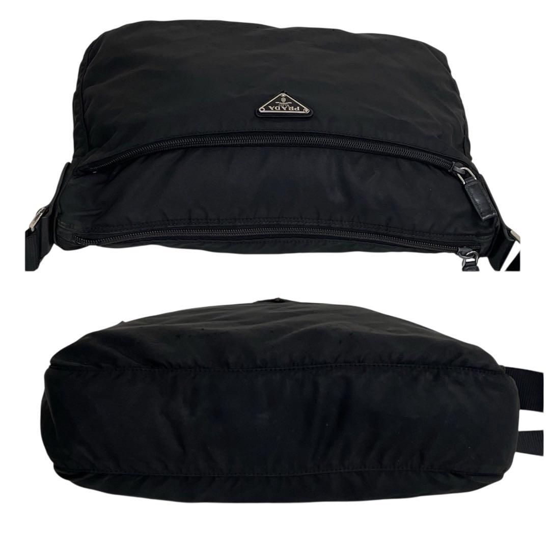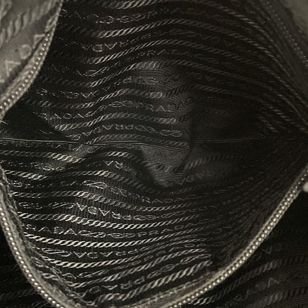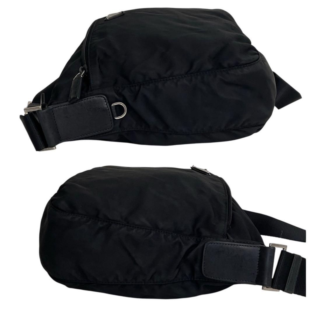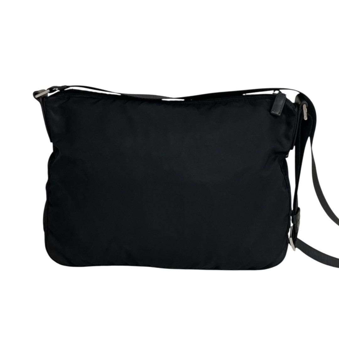 ブランドを象徴するトライアングルロゴがフロントに輝き、シンプルなナイロン素材にラグジュアリーな存在感を添えています。