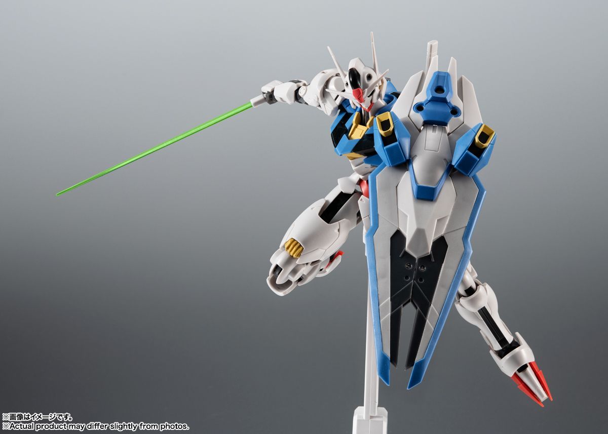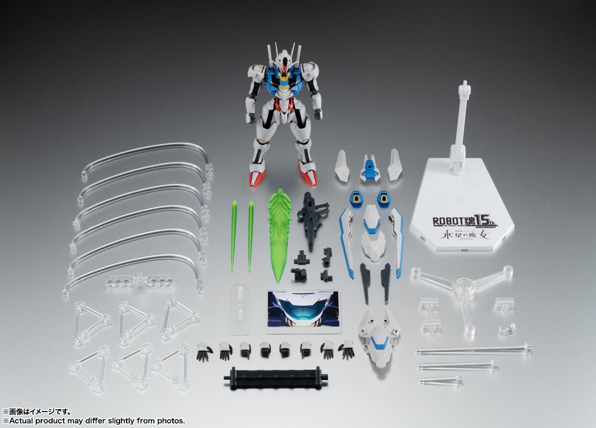 従来の「ガンダム・エアリアル ver. A.N.I.M.E.」にROBOT魂15周年を記念したオリジナル台座とキャラクターカットインシートが新たに付属!更にサーベルやブレード用のビームエフェクトは劇中で使用されていたグリーンに変更!