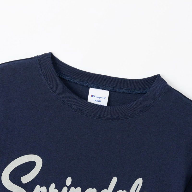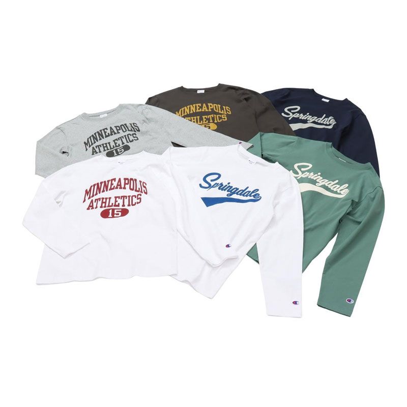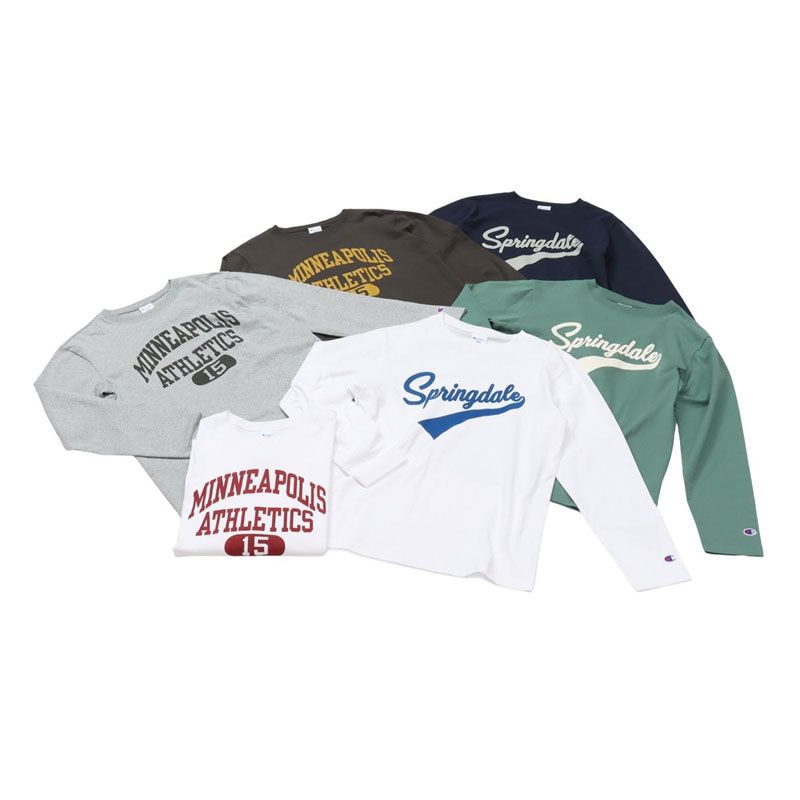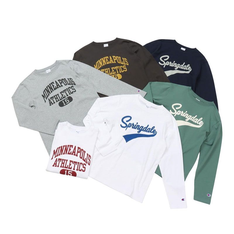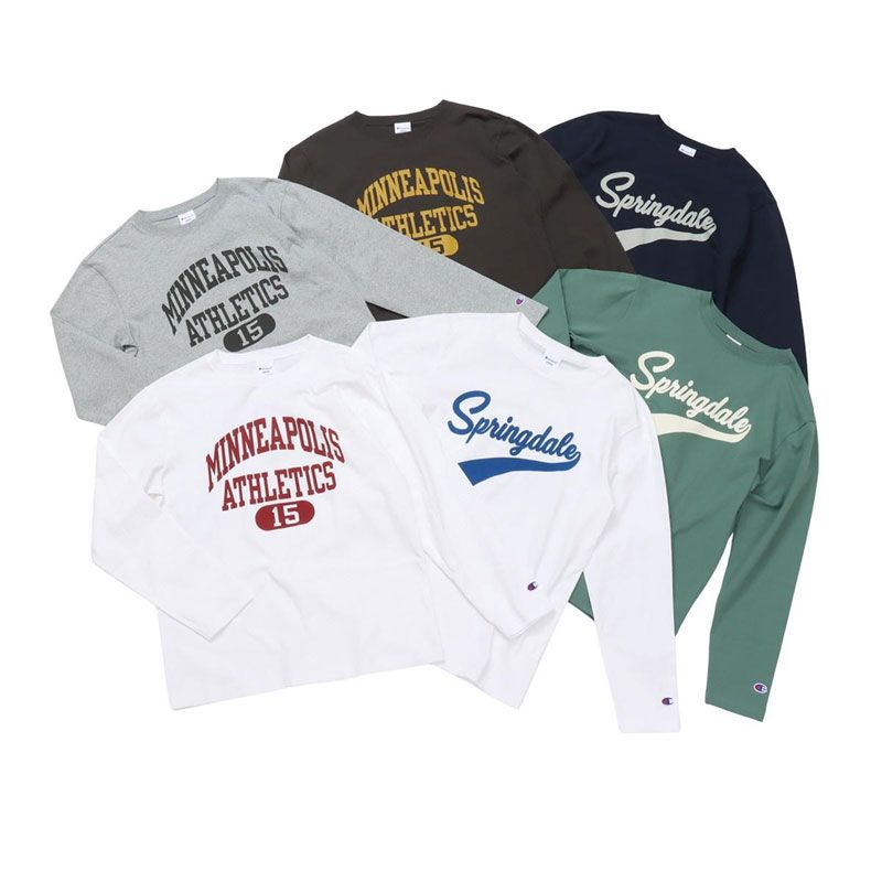 胸のプリントはチャンピオンと親和性の高いカレッジ風の書体をベースにしたもので、文字とリボンを組み合わせたデザイン、アーチ状およびストレート状に組んだ文字とカプセルナンバーを組み合わせたデザインの2タイプ(6種類)。