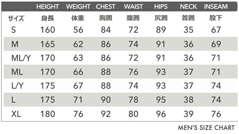 《MLサイズ》身長/167~173cm 体重/63~69kg