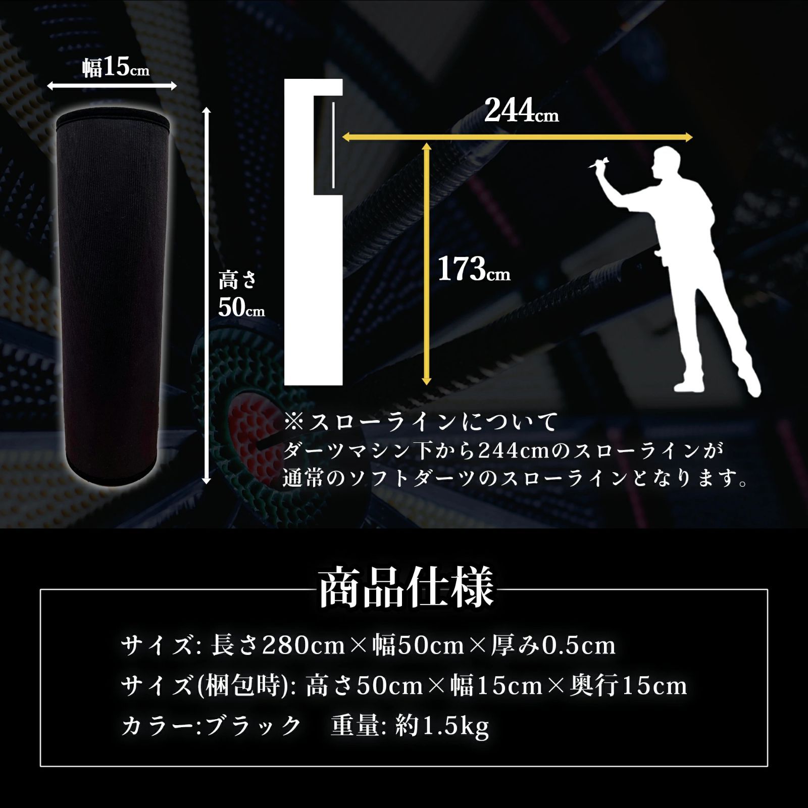 床に敷くだけでスローラインがひと目でわかる便利なダーツマット。無地ブラックのスタイリッシュデザインで、家庭用からダーツバーまで幅広く活躍します。
