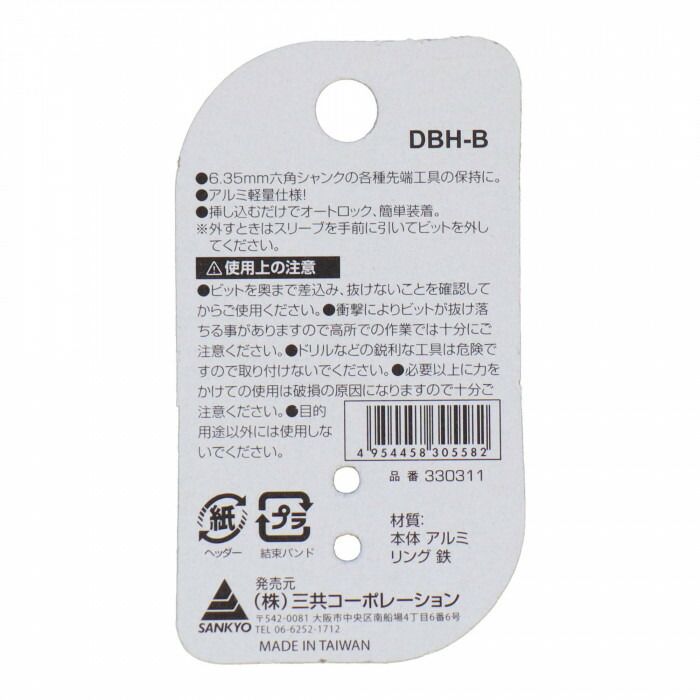6.35mm六角シャンクの各種先端工具の保持に。持ちやすく操作性が上がる本体形状とローレット仕上げにより、手袋などを装着したままでもビットの着脱がしやすい。アルミ軽量仕様。