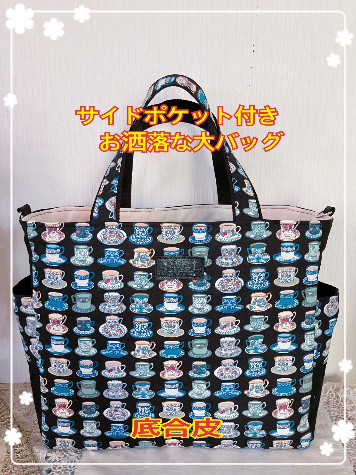 サイドポケットには ペットボトルや携帯 傘など入ります。また合皮を底に使用しています。